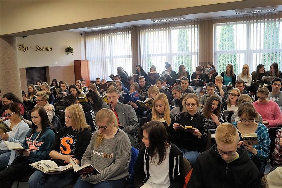 Podczas przerw biliśmy rekord w ilości osób czytających. Tego dnia czytało 162 uczniów. Udowodniliśmy, że książki to świetny sposób na spędzenie każdej wolnej chwili, pamiętając że czytanie poszerza wiedzę, rozwija słownictwo, wyobraźnię, umiejętności komunikacji oraz szereg innych kompetencji w nas drzemiących. Chętni przeczytali ulubione fragmenty z wybranych przez siebie pozycji. Temu edukacyjnemu wydarzeniu towarzyszyło wiele humoru i zabawy.