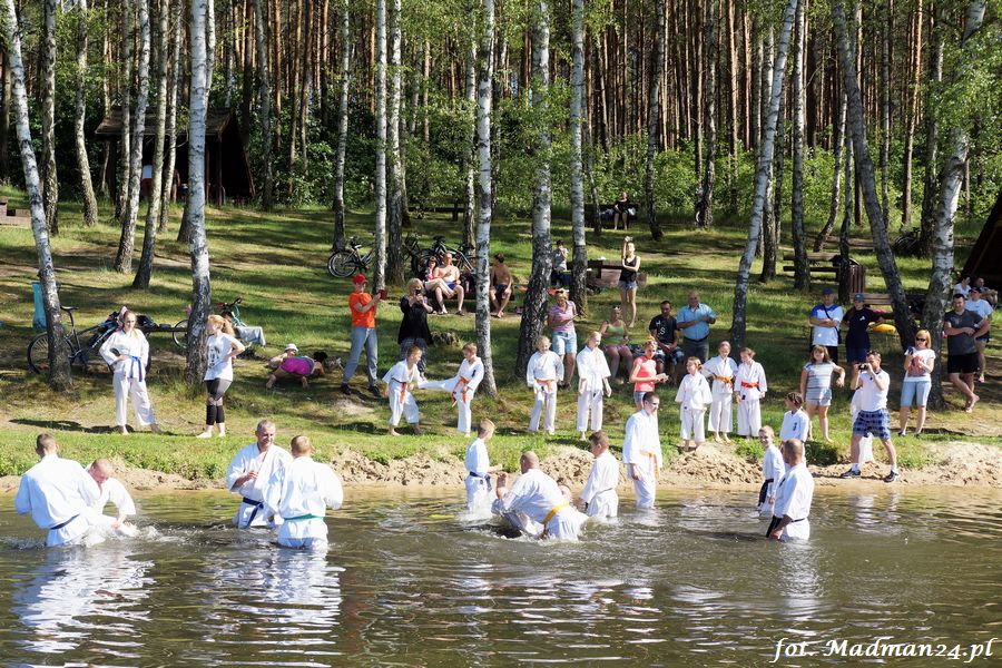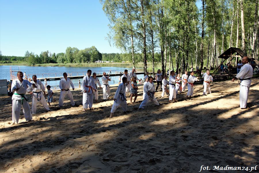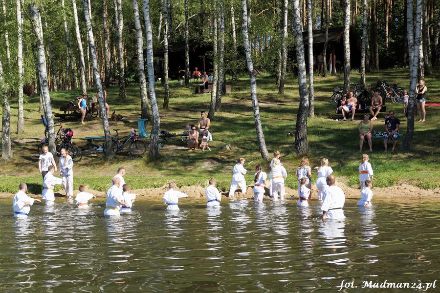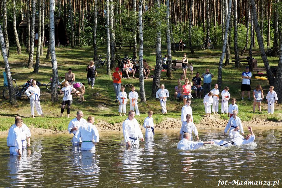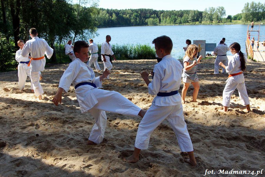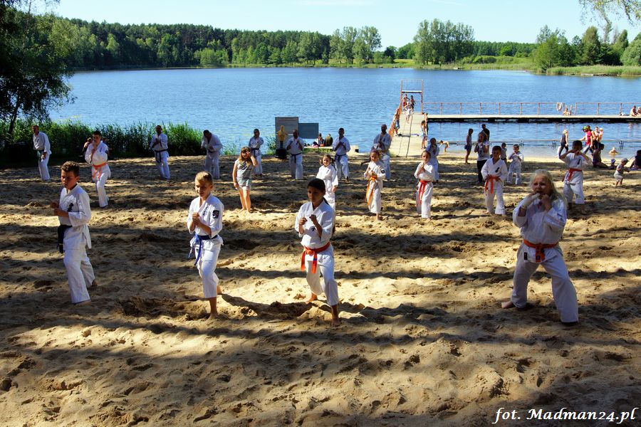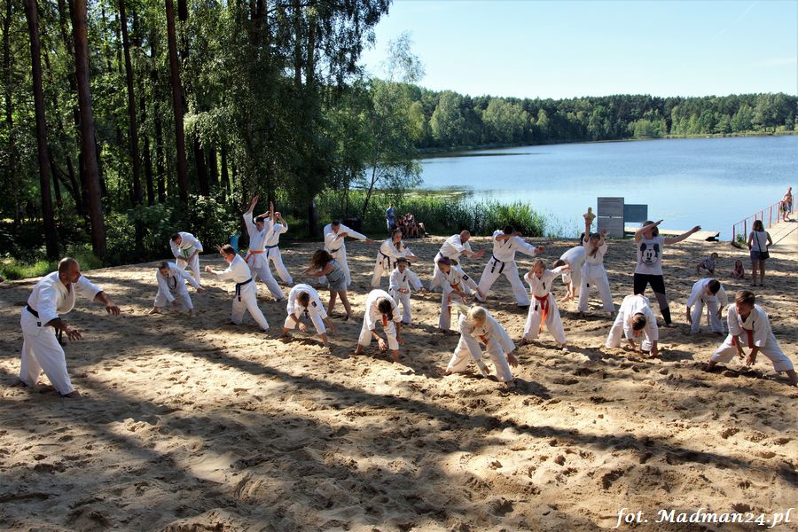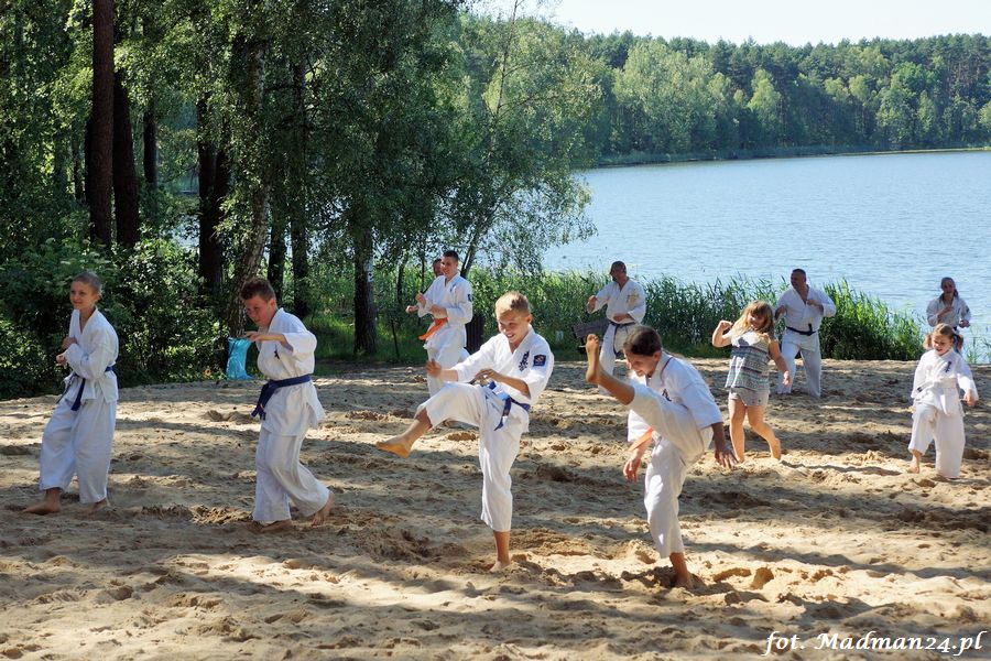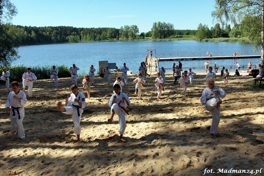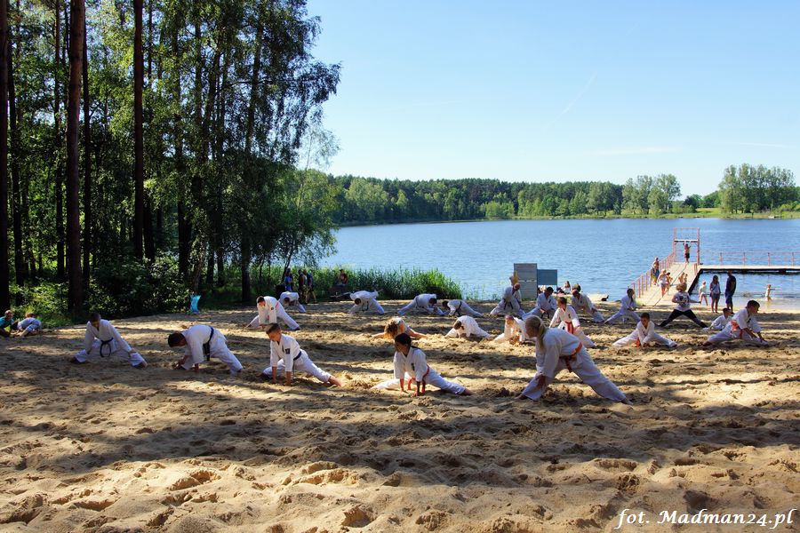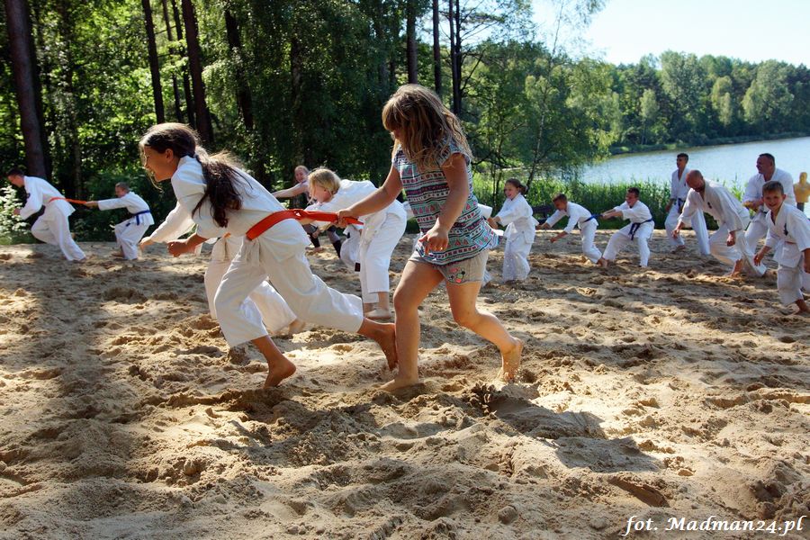 Trening karateków tym razem odbył się nad jeziorem Ostrowskim. Wystarczył jeden wpis Karola Buksztynowicza na Facebooku https://www.facebook.com/karol.buksztynowicz i nad jeziorem zaroiło się od ludzi w kimonach. Karatecy biegali po lesie, grali w piłkę, trenowali w wodzie i na plaży oraz przeciągali linę. To ostatnie wzbudziło bez wątpienia najwięcej emocji. Był pot i była zabawa. Na plaży byli także badmintoniści, a wśród nich świeżo upieczony „Brązowy Robert”. Tym razem jednak tylko w roli obserwatorów.