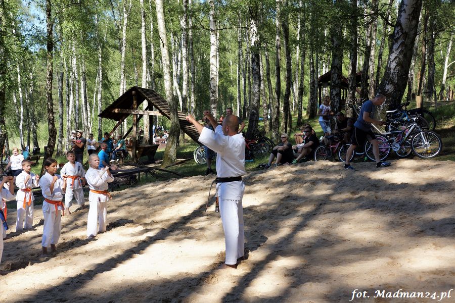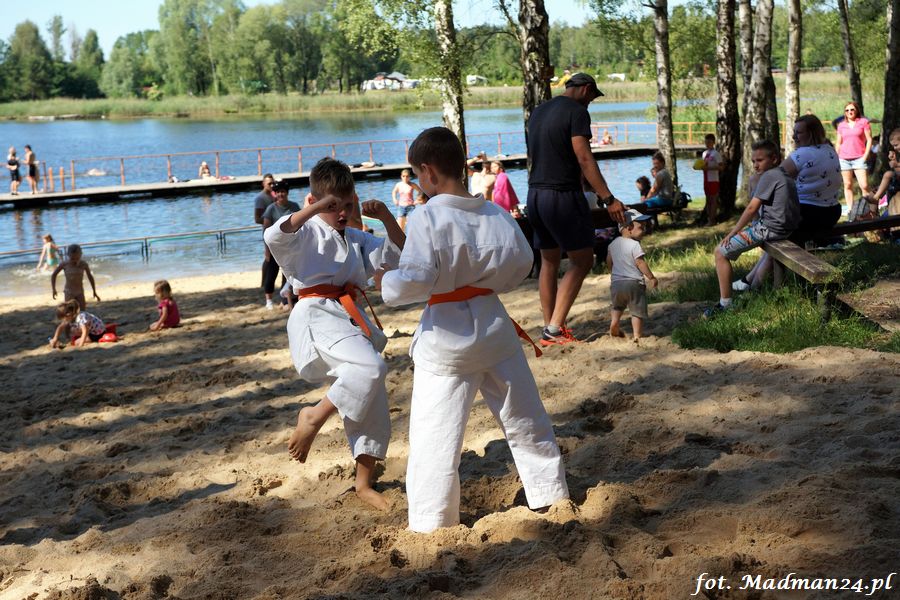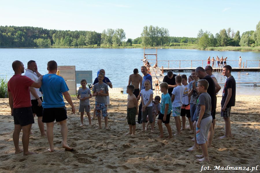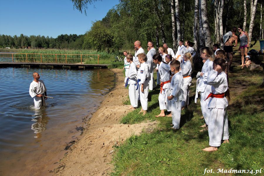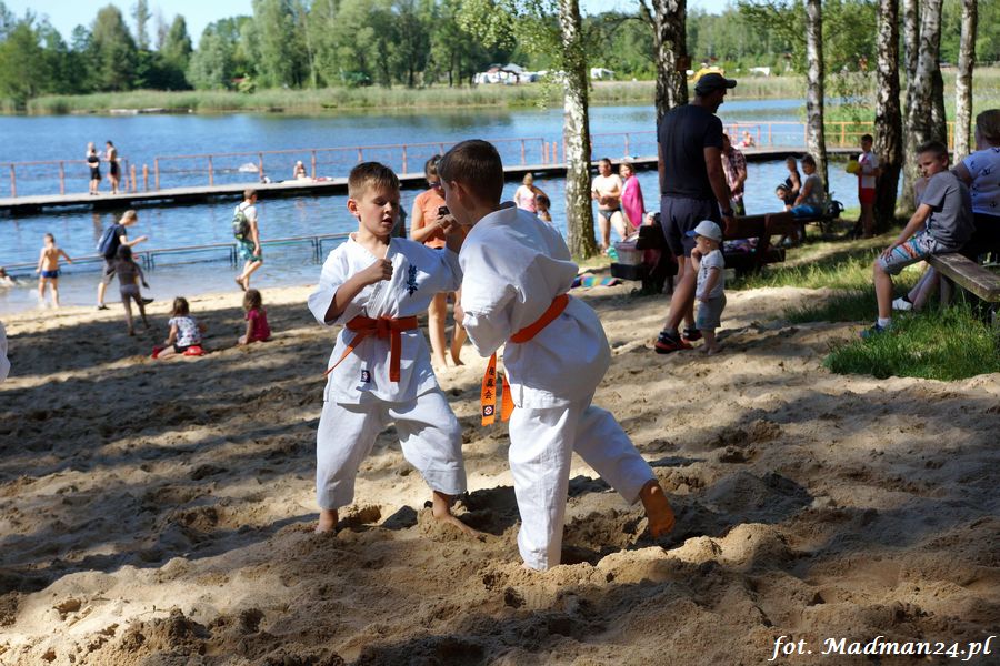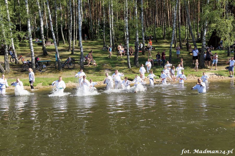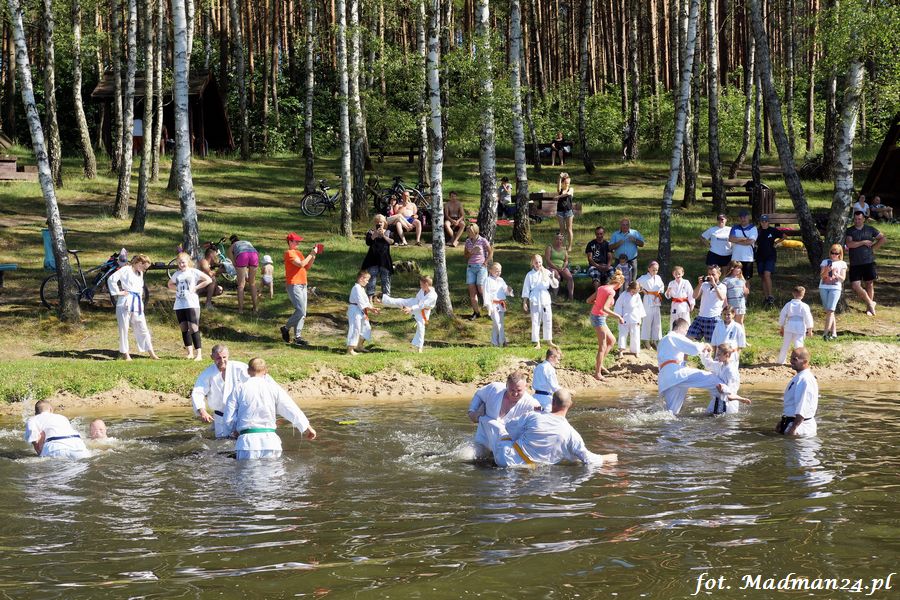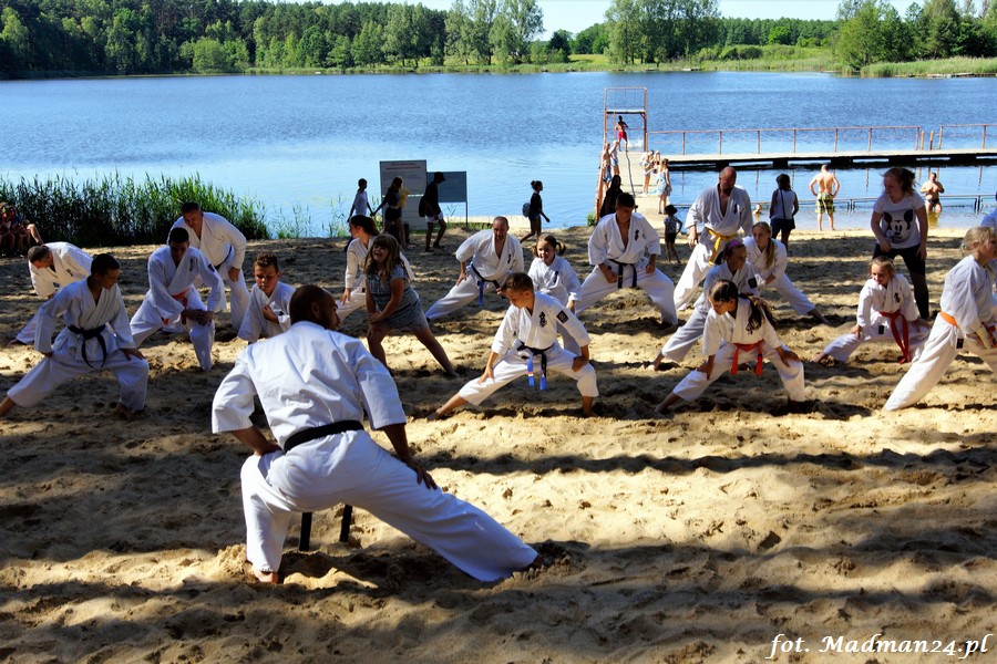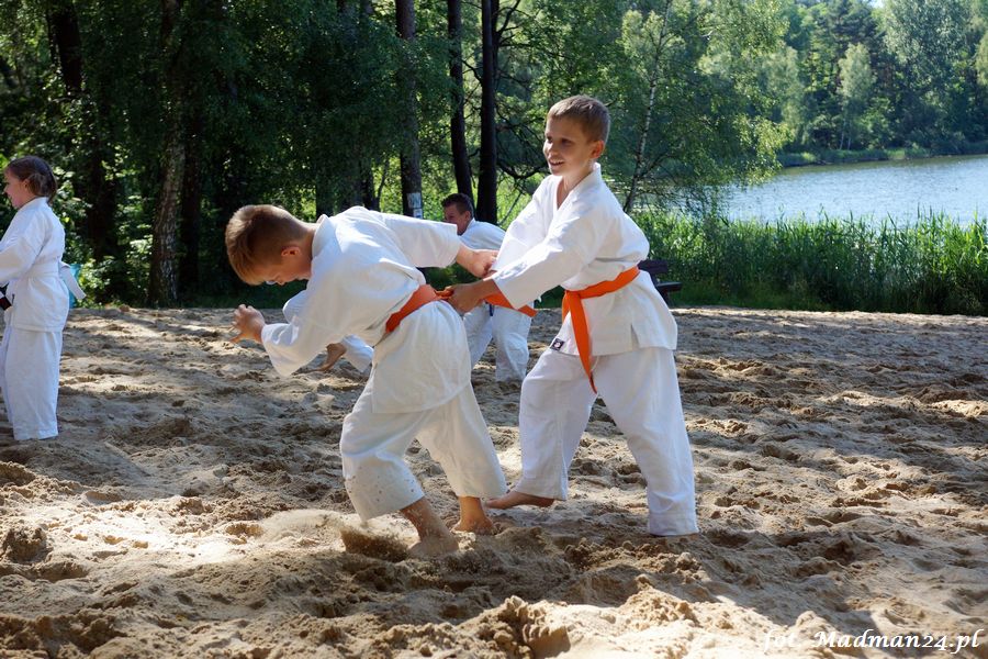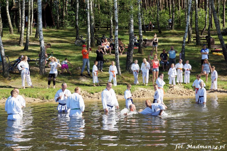 Trening karateków tym razem odbył się nad jeziorem Ostrowskim. Wystarczył jeden wpis Karola Buksztynowicza na Facebooku https://www.facebook.com/karol.buksztynowicz i nad jeziorem zaroiło się od ludzi w kimonach. Karatecy biegali po lesie, grali w piłkę, trenowali w wodzie i na plaży oraz przeciągali linę. To ostatnie wzbudziło bez wątpienia najwięcej emocji. Był pot i była zabawa. Na plaży byli także badmintoniści, a wśród nich świeżo upieczony „Brązowy Robert”. Tym razem jednak tylko w roli obserwatorów.
