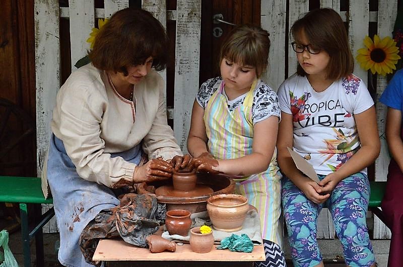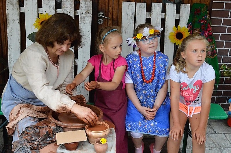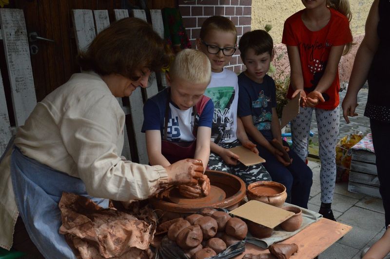Na wtorkowych zajęciach tegorocznych Akcji na Wakacje odwiedziła nas pani Anna Barzyk – artystka, pochodząca z Wilkowa (k. Świebodzina), należąca do Stowarzyszenia Twórców Ludowych, pasjonująca się garncarstwem, ale i koronką – frywolitką, decoupagem oraz ceramiką.