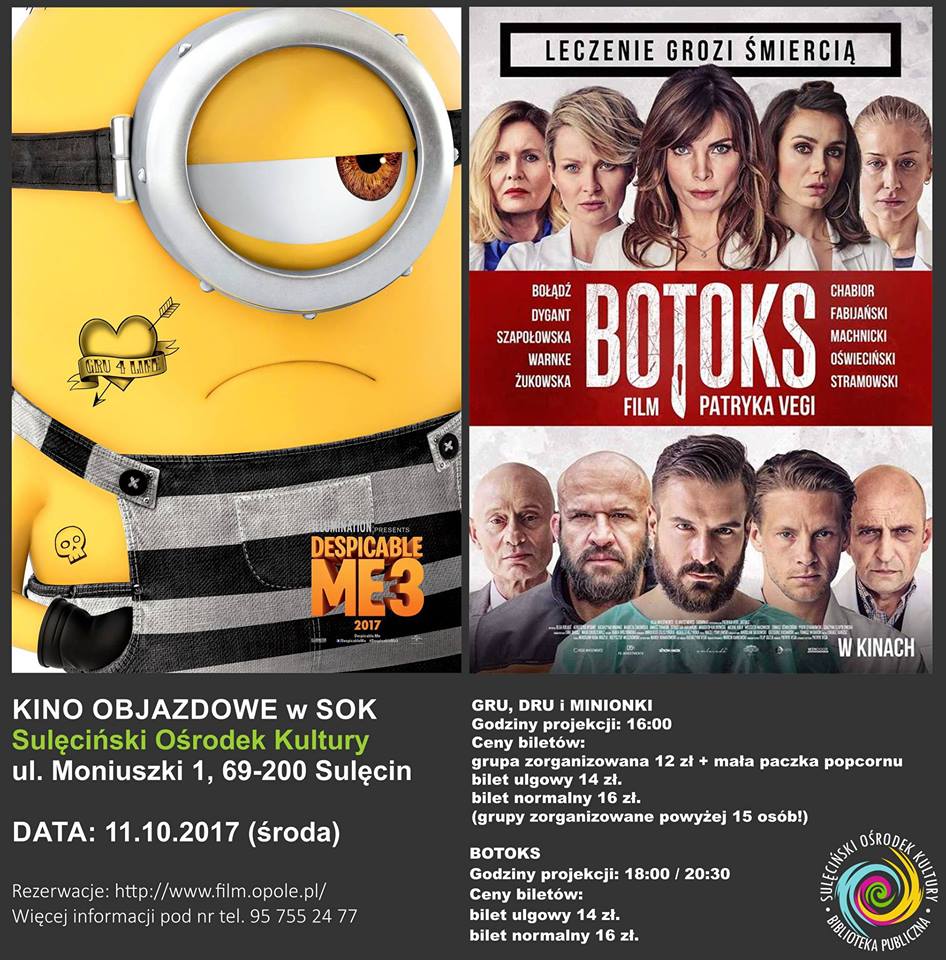 Sulęciński Ośrodek Kultury Kino Objazdowe w SOK ul. Moniuszki 1, 69-200 Sulęcin DATA: 11.10.2017 (środa) GRU, DRU i MINIONKI Godziny…