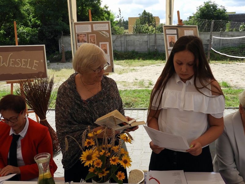 Na początku wysłuchaliśmy piosenki z repertuaru Marka Grechuty z tekstem właśnie z dramatu ,,Wesele”. Uświetnieniem imprezy był występ rodzimej, młodej artystki Marii Miotk, która zagrała na skrzypcach melodie nawiązujące do dawnych tradycji polskich m.in. mazurki. Jak zawsze wspólne czytanie dzieł literatury polskiej jest doskonałą okazją do spotkań, które mają na celu łączenie pokoleń. Starsi i młodsi razem przeczytali III akt, z podziałem na role, co sprawiło tez wiele zabawnych sytuacji. Natomiast akty I i II oraz rys historyczny z analizą symboliki ,,Wesela” zostały omówione. Prelekcję na temat życia i twórczości Stanisława Wyspiańskiego przygotowała i wygłosiła polonistka, przedstawiciel Szkoły Podstawowej w Krzeszycach pani Natalia Haza- Galant. Wszyscy, którzy mieli własny egzemplarz ,,Wesela” otrzymali okolicznościową pieczęć.