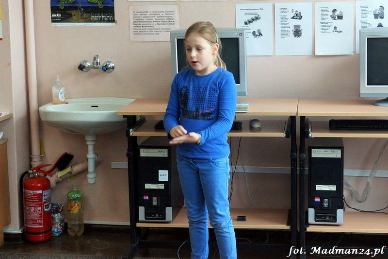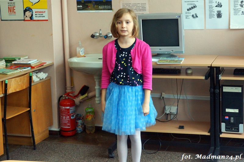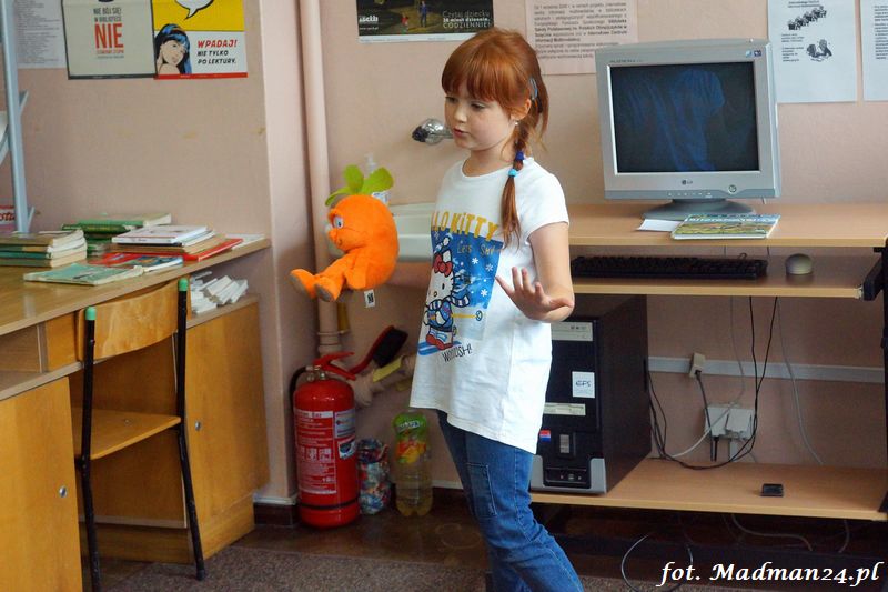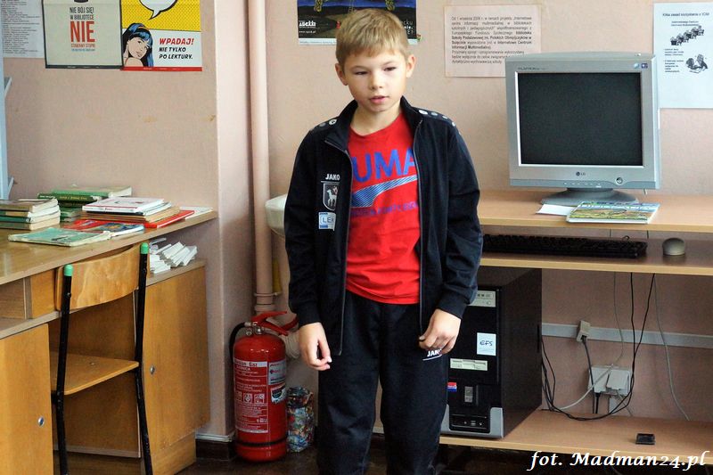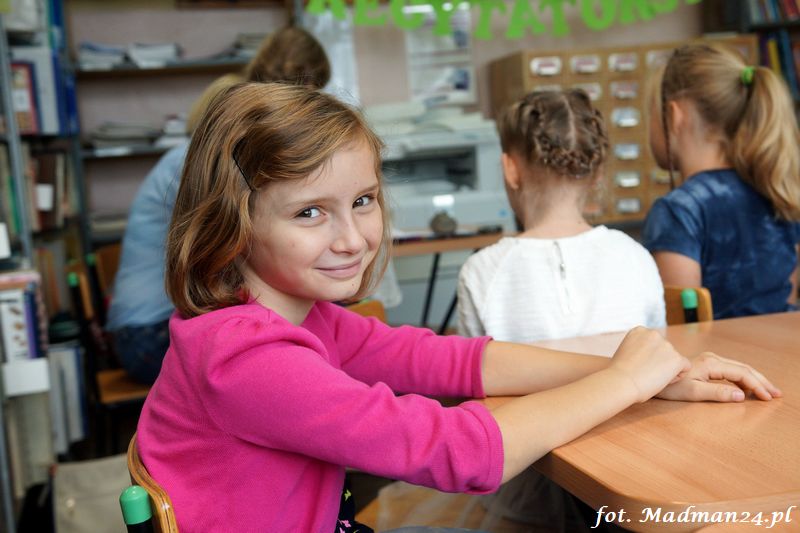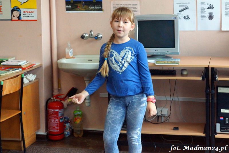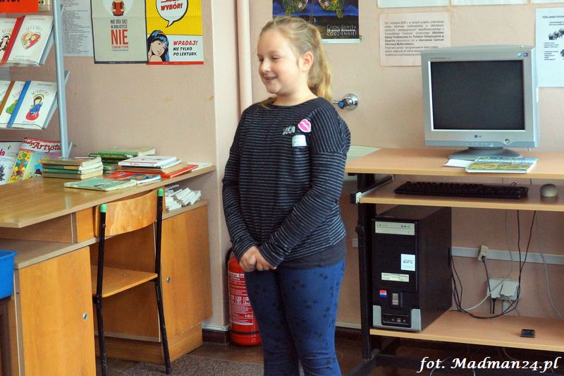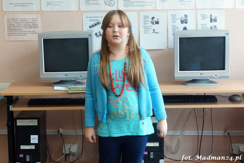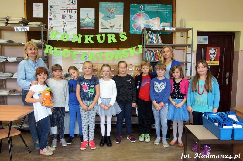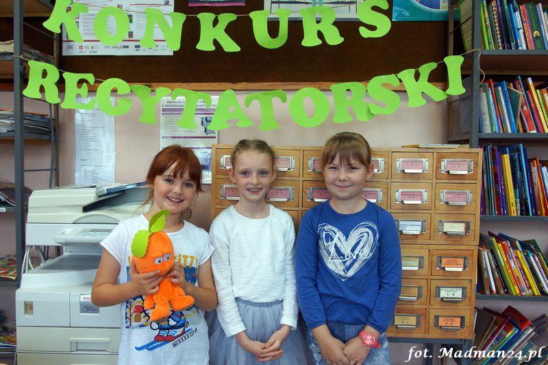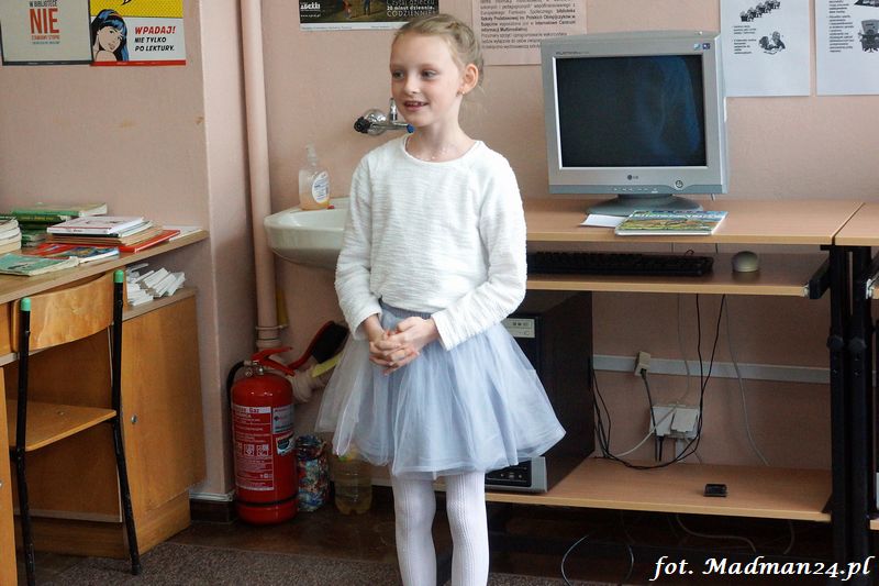 Konkurs recytatorski klas I-III, czyli szkolne eliminacje do konkursu powiatowego. Dziesięcioro śmiałków przystąpiło w szranki w szkolnych eliminacjach recytatorskich. Wśród nich jeden „rodzynek”. Każdy z uczestników recytował dwa wiersze. Poziom był naprawdę bardzo wysoki, więc jury miało trudne zadanie. Dla mnie wszyscy byli zwycięzcami, ale jak to w konkursach bywa na podium są tylko trzy miejsca. Gdy jury udało się na naradę, to zostałem z dziećmi w bibliotece. Lubimy się wzajemnie, więc nie było żadnych problemów. Panie wróciły i ogłosiły laureatów. Nie było miejsc tylko wybór laureatów, którzy będą reprezentować szkołę na konkursie powiatowym.