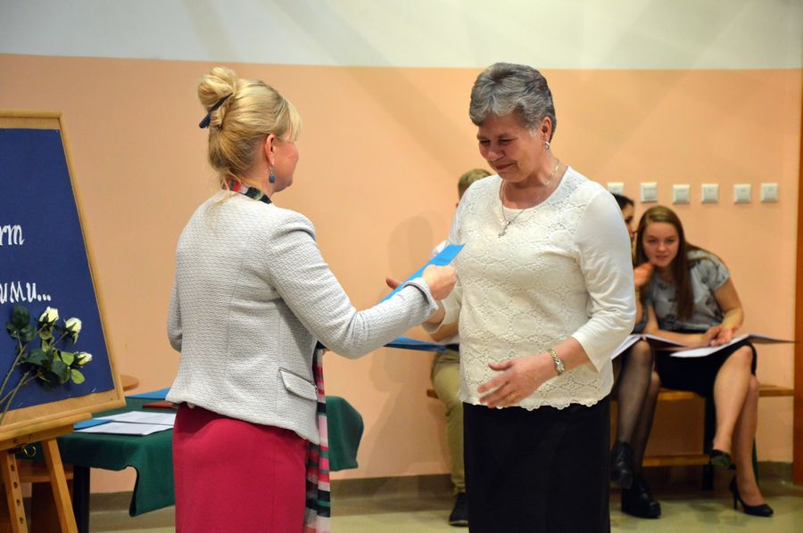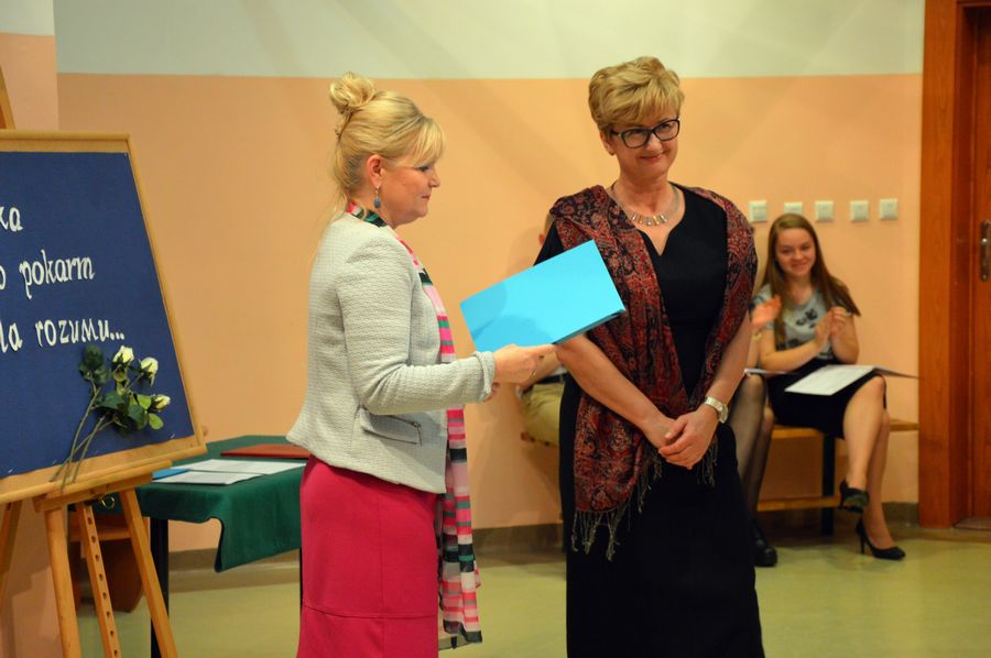 Pani Dyrektor Aleksandra Jasicka – Szabat tradycyjnie już tego dnia podziękowała nauczycielom za trud i zaangażowanie wkładane każdego dnia w edukację i wychowanie młodego pokolenia oraz nagrodziła tych nauczycieli, którzy w ubiegłym roku szkolnym wyróżnili się szczególnie. Nagrody dyrektora szkoły otrzymali: nauczyciele-Renata Jankowska, Wioletta Bartniak, Wojciech Lencewicz i  Łukasz Chajec, pracownicy- Barbara Pawlak, Leopold Karaś, Elżbieta Kotowicz, Paulina Grochowska, Marianna Jażyna, Dorota Masztalerz, natomiast nagrodę Starosty Sulęcińskiego z rąk Agnieszki Sławiak otrzymała Aleksandra Jasicka-Szabat oraz Monika Pilecka.