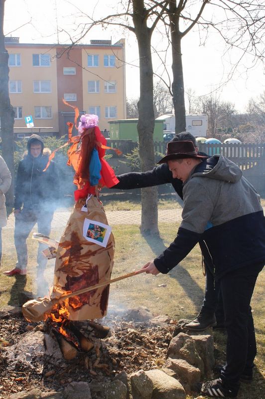 Następnie, żeby tradycji stało się zadość wszyscy artyści, podopieczni, rodzice i zaproszeni goście powędrowali na plac szkolny gdzie nastąpiło spalenie ekologicznej marzanny. Zaraz potem można było skosztować ciepłych kiełbasek z grilla i upieczonych przez naszych uczniów pysznych ciast.