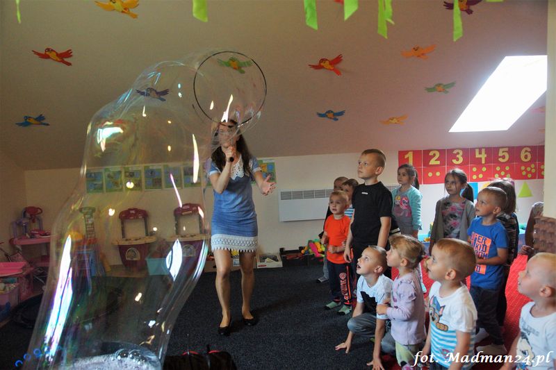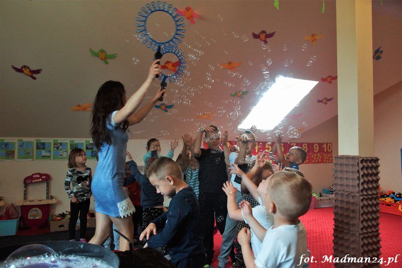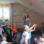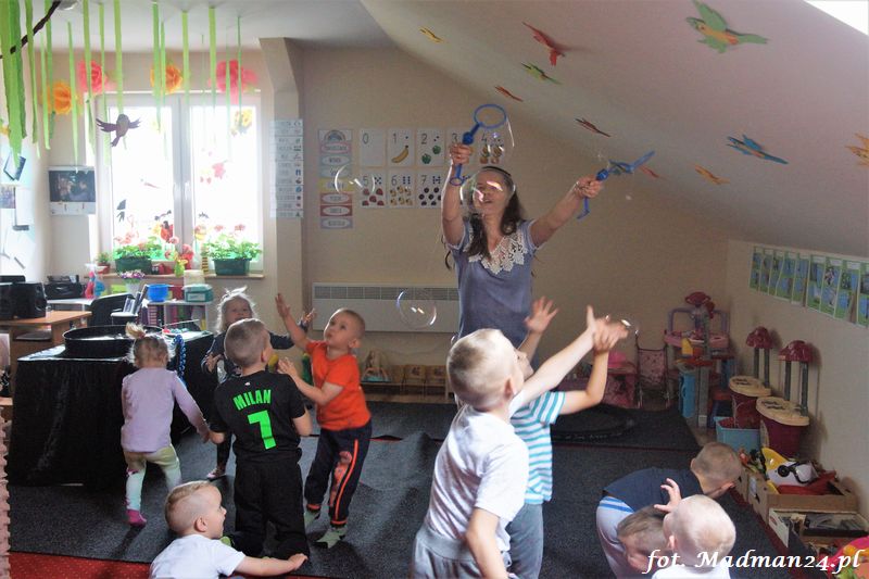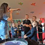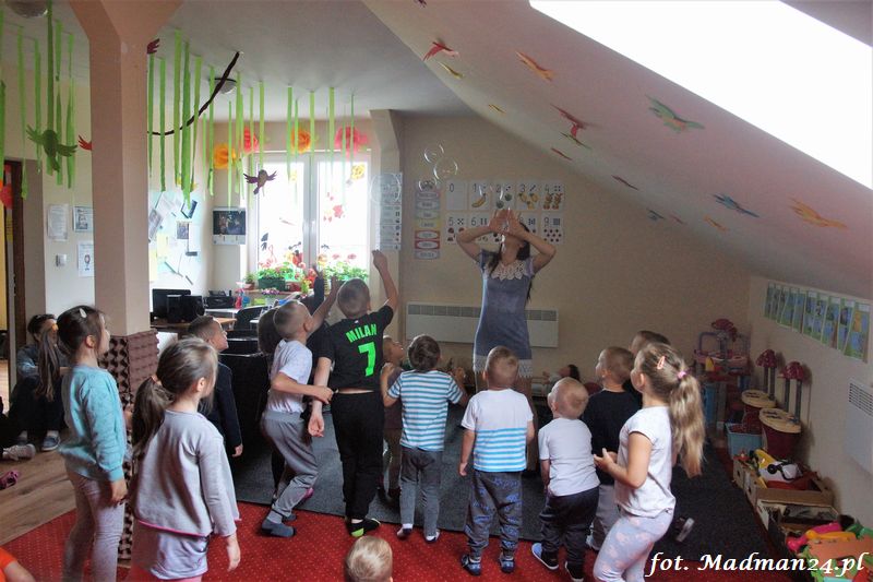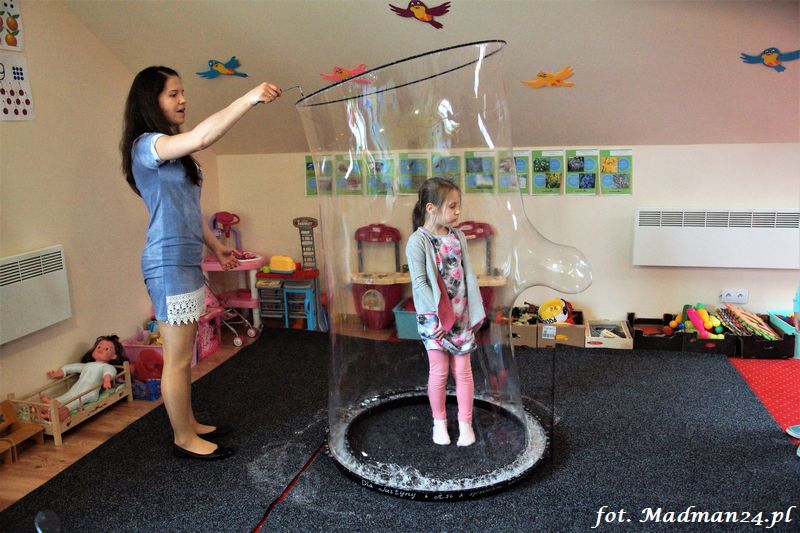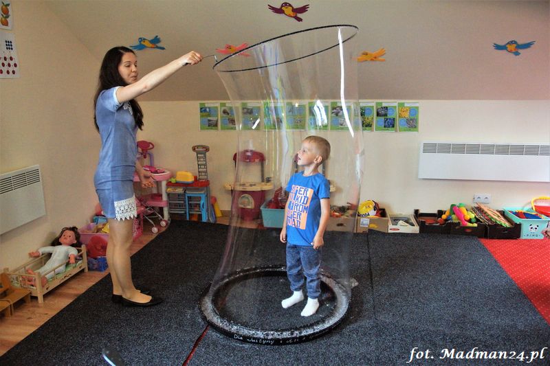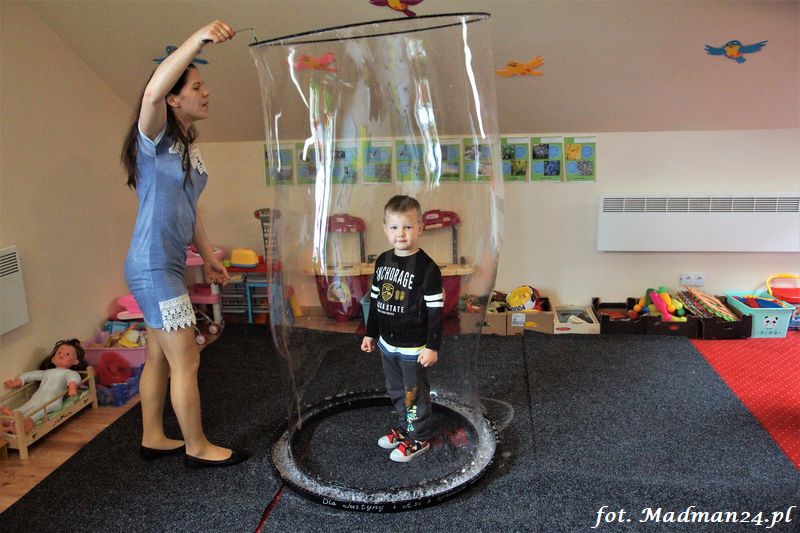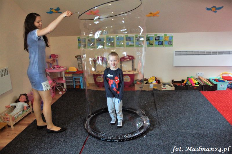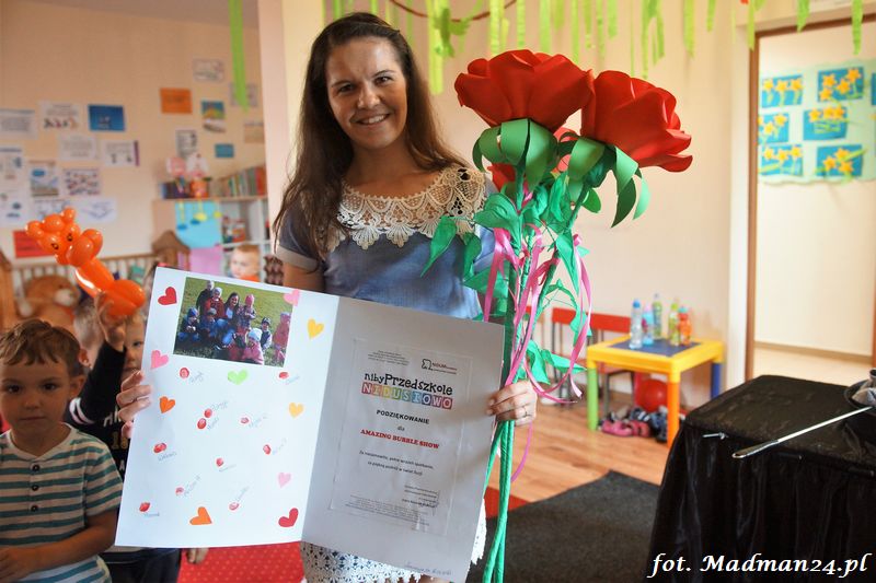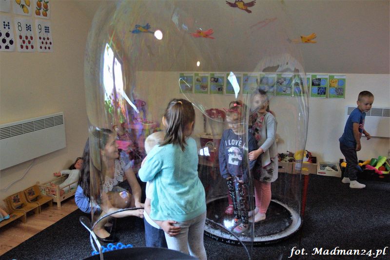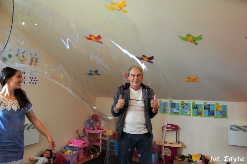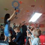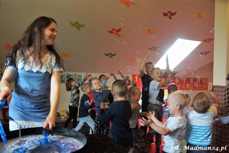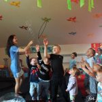 Bańki mydlane: duże, małe, a nawet „palące”. Kwintesencja imprezy to „Nidusie w ogromnych mydlanych bańkach”. Tak gwoli ścisłości to dorośli też się tam znaleźli. Było dużo śmiechu, a przede wszystkim wspaniała zabawa. Wspólne zdjęcie zakończyło ten niesamowity „mydlany pokaz”. Nidusie otrzymały od p. Justyny prezenty, a ona od nich pisemne (taki nidusiowy dyplom) podziękowania oraz nidusiowe kwiaty. Proszę mi wierzyć, takie kwiaty są jedyne w swoim rodzaju, bo są wieczne. Maluchy ten dzień na pewno zapamiętają na długo.