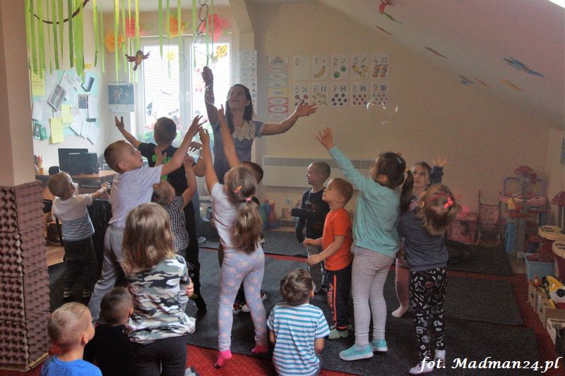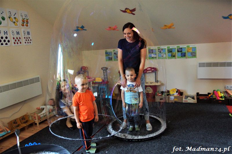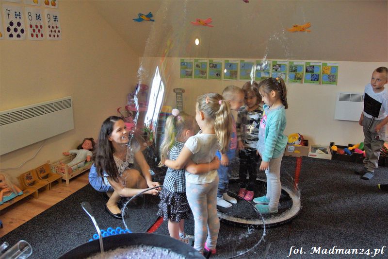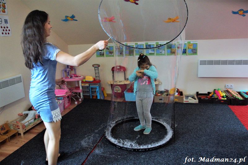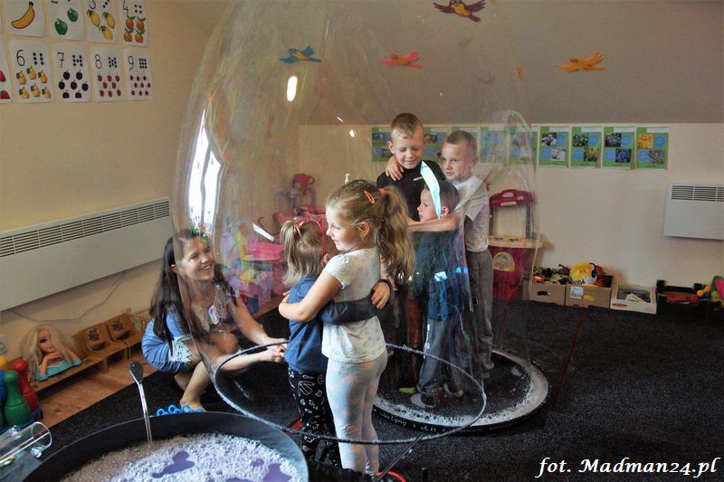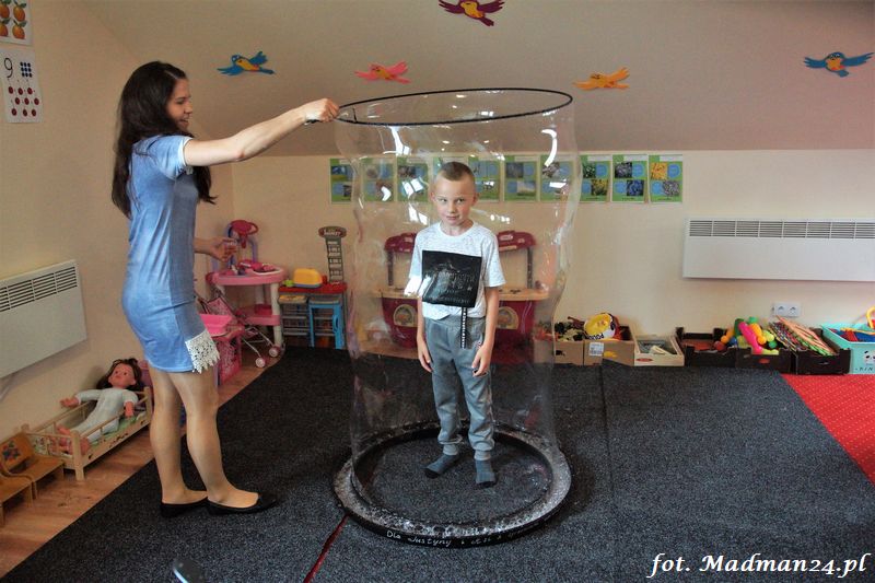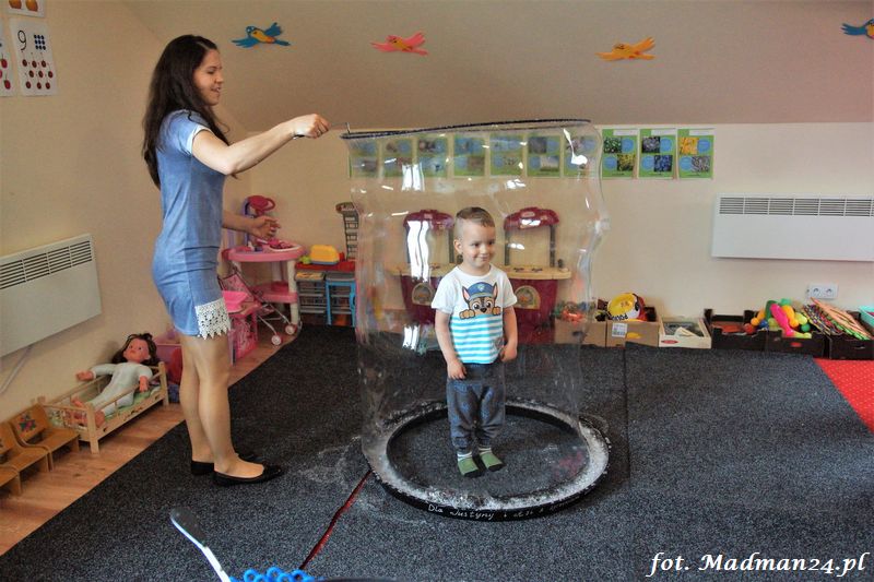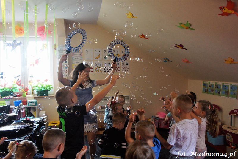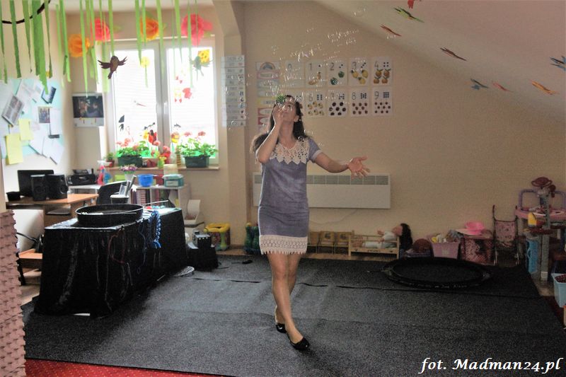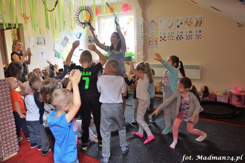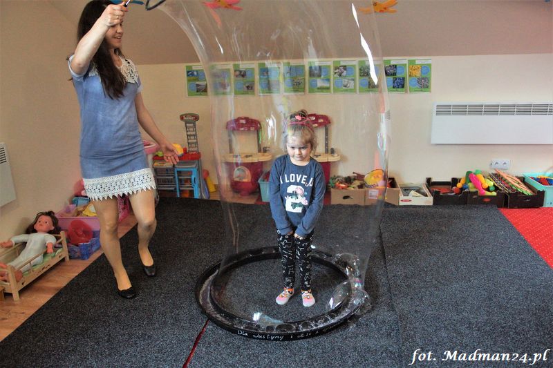 Bańki mydlane: duże, małe, a nawet „palące”. Kwintesencja imprezy to „Nidusie w ogromnych mydlanych bańkach”. Tak gwoli ścisłości to dorośli też się tam znaleźli. Było dużo śmiechu, a przede wszystkim wspaniała zabawa. Wspólne zdjęcie zakończyło ten niesamowity „mydlany pokaz”. Nidusie otrzymały od p. Justyny prezenty, a ona od nich pisemne (taki nidusiowy dyplom) podziękowania oraz nidusiowe kwiaty. Proszę mi wierzyć, takie kwiaty są jedyne w swoim rodzaju, bo są wieczne. Maluchy ten dzień na pewno zapamiętają na długo.
