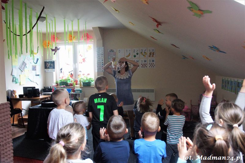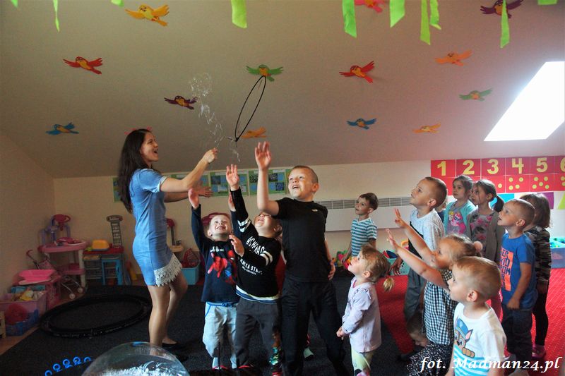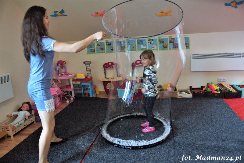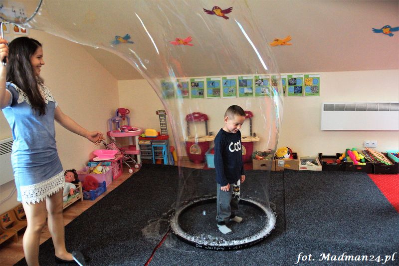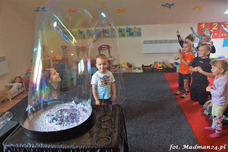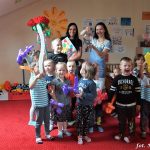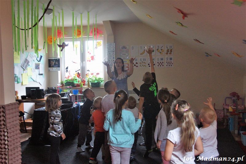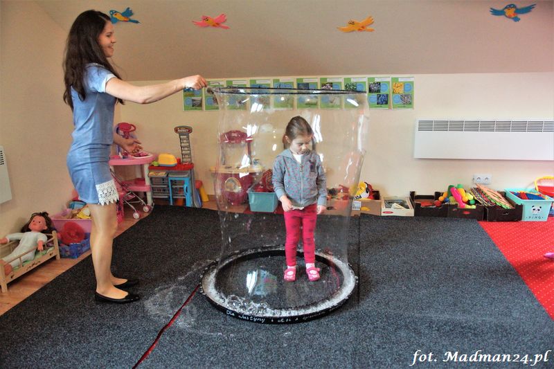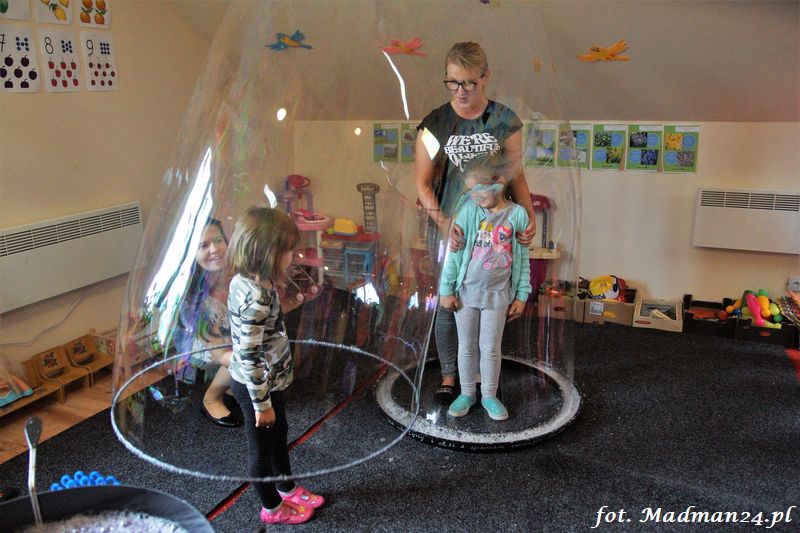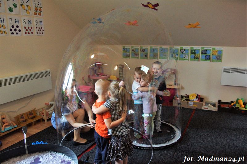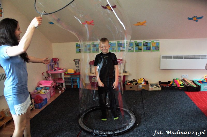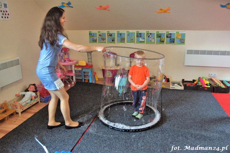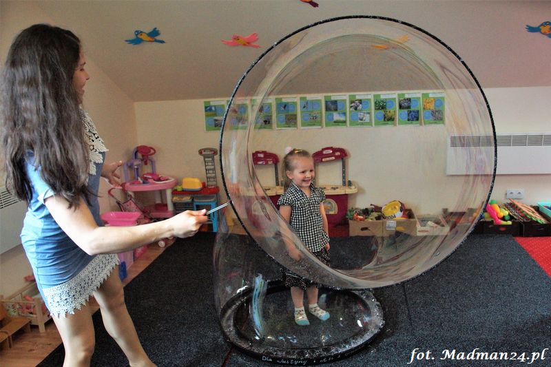 Bańki mydlane: duże, małe, a nawet „palące”. Kwintesencja imprezy to „Nidusie w ogromnych mydlanych bańkach”. Tak gwoli ścisłości to dorośli też się tam znaleźli. Było dużo śmiechu, a przede wszystkim wspaniała zabawa. Wspólne zdjęcie zakończyło ten niesamowity „mydlany pokaz”. Nidusie otrzymały od p. Justyny prezenty, a ona od nich pisemne (taki nidusiowy dyplom) podziękowania oraz nidusiowe kwiaty. Proszę mi wierzyć, takie kwiaty są jedyne w swoim rodzaju, bo są wieczne. Maluchy ten dzień na pewno zapamiętają na długo.
