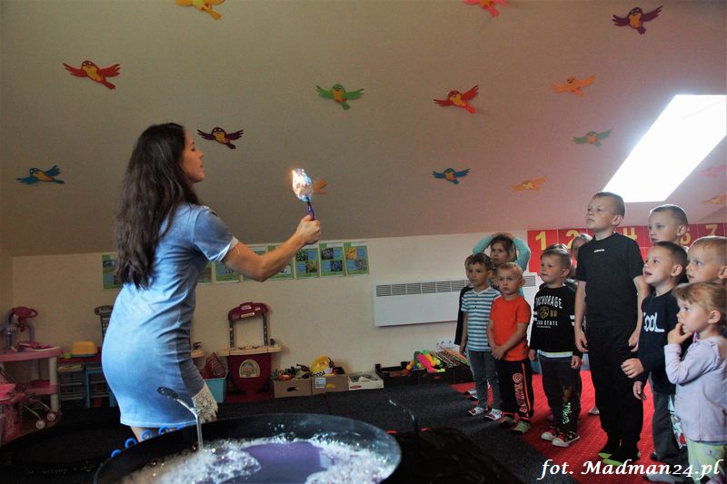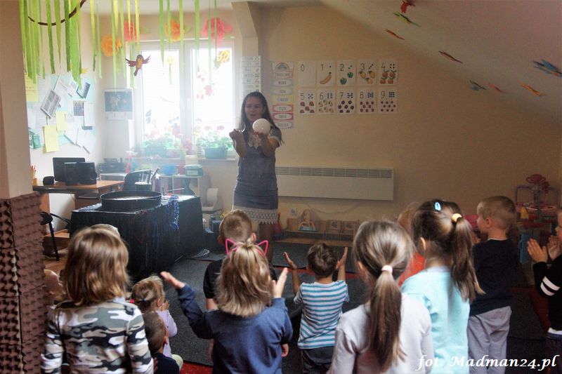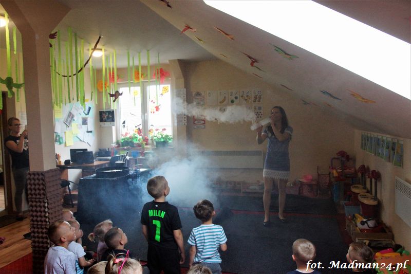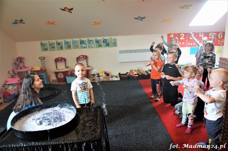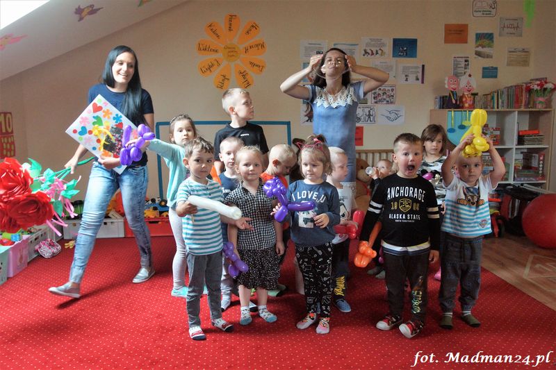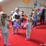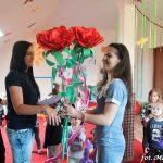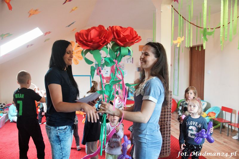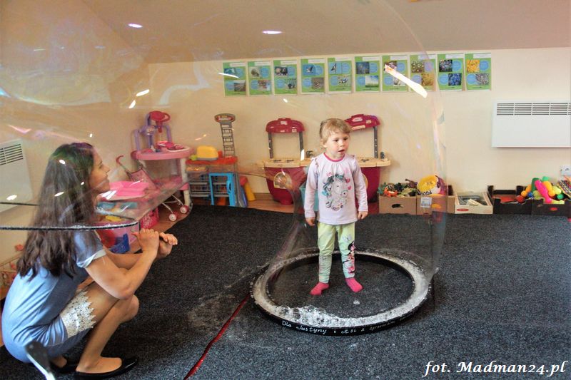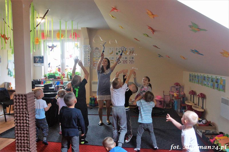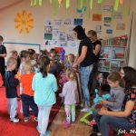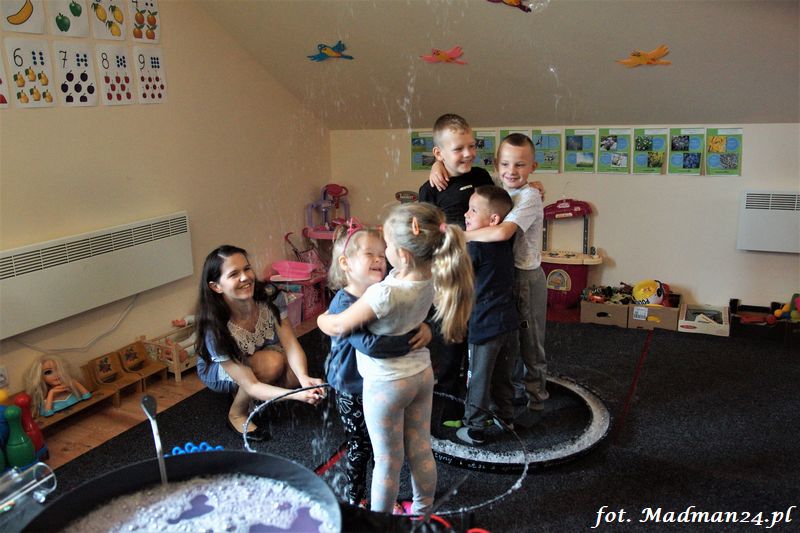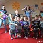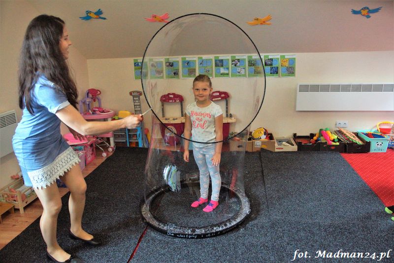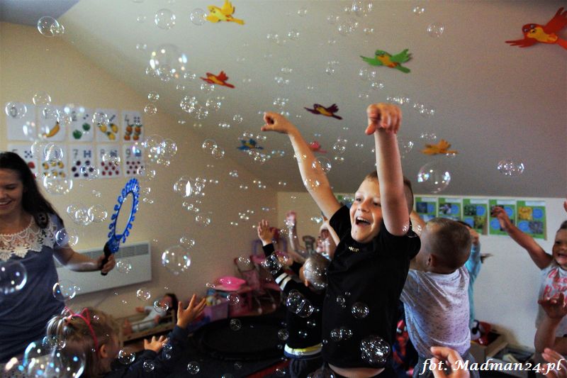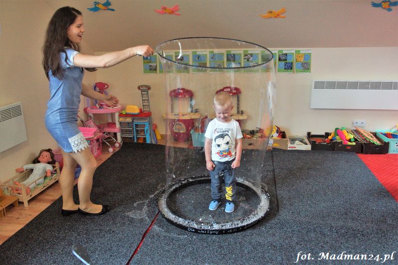 Bańki mydlane: duże, małe, a nawet „palące”. Kwintesencja imprezy to „Nidusie w ogromnych mydlanych bańkach”. Tak gwoli ścisłości to dorośli też się tam znaleźli. Było dużo śmiechu, a przede wszystkim wspaniała zabawa. Wspólne zdjęcie zakończyło ten niesamowity „mydlany pokaz”. Nidusie otrzymały od p. Justyny prezenty, a ona od nich pisemne (taki nidusiowy dyplom) podziękowania oraz nidusiowe kwiaty. Proszę mi wierzyć, takie kwiaty są jedyne w swoim rodzaju, bo są wieczne. Maluchy ten dzień na pewno zapamiętają na długo.