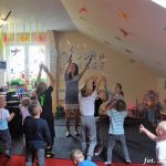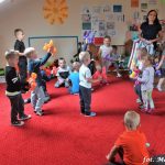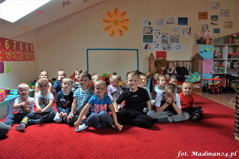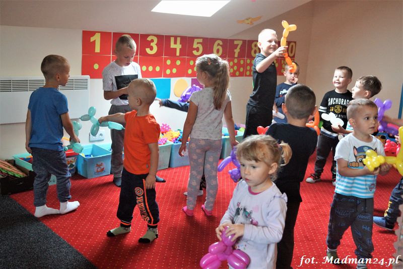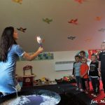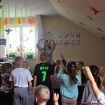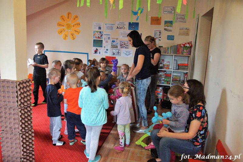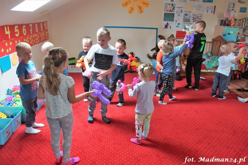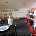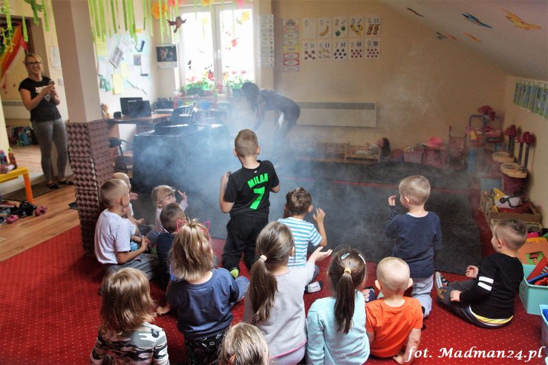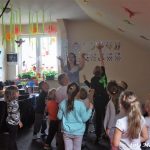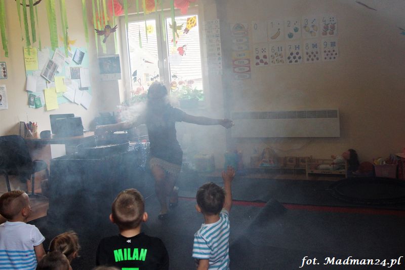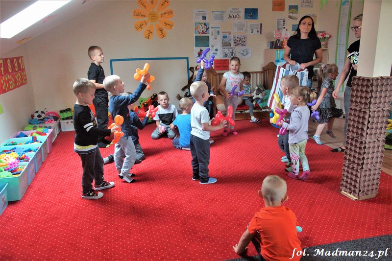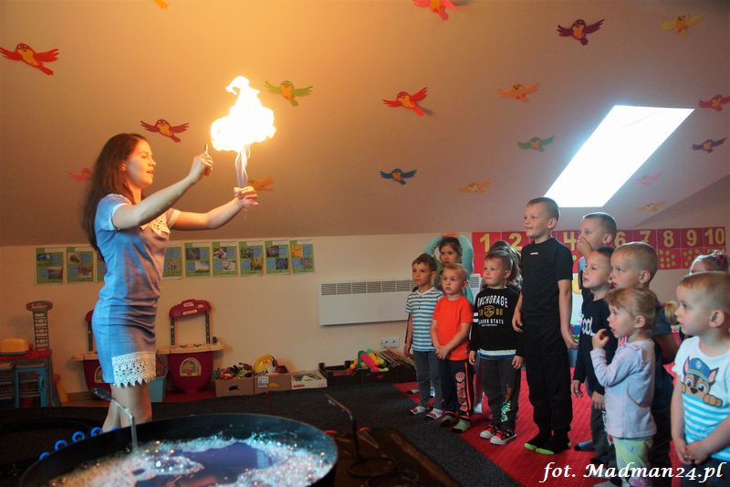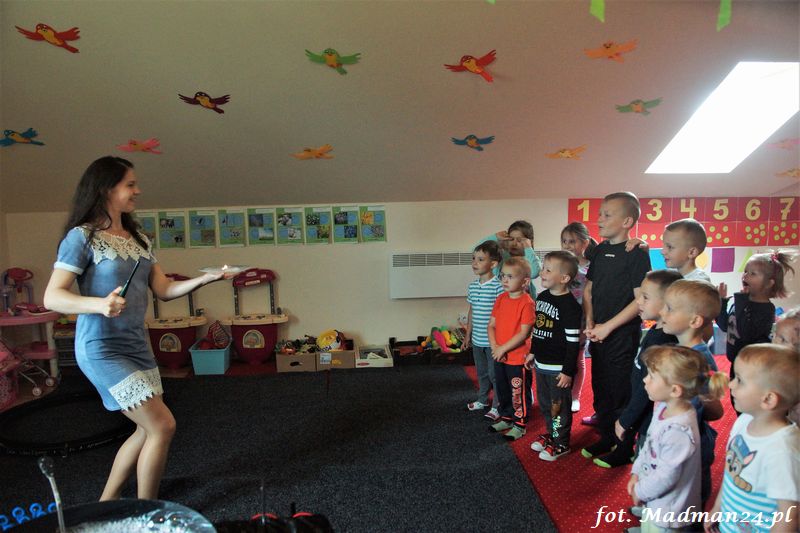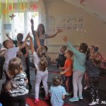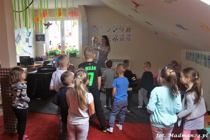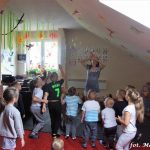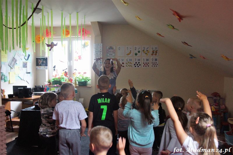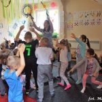 Bańki mydlane: duże, małe, a nawet „palące”. Kwintesencja imprezy to „Nidusie w ogromnych mydlanych bańkach”. Tak gwoli ścisłości to dorośli też się tam znaleźli. Było dużo śmiechu, a przede wszystkim wspaniała zabawa. Wspólne zdjęcie zakończyło ten niesamowity „mydlany pokaz”. Nidusie otrzymały od p. Justyny prezenty, a ona od nich pisemne (taki nidusiowy dyplom) podziękowania oraz nidusiowe kwiaty. Proszę mi wierzyć, takie kwiaty są jedyne w swoim rodzaju, bo są wieczne. Maluchy ten dzień na pewno zapamiętają na długo.
