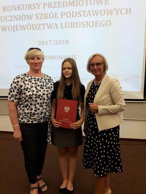 4 czerwca 2018 r. o godzinie 1100 w Wojewódzkiej i Miejskiej Bibliotece Publicznej w Gorzowie Wielkopolskim, odbyło się uroczyste podsumowanie konkursów przedmiotowych dla uczniów szkól podstawowych województwa lubuskiego organizowanych w roku szkolnym 2017/2018 przez Lubuskiego Kuratora Oświaty. Podczas uroczystości laureatom wręczone zostały stosowne zaświadczenia oraz nagrody. Podziękowania otrzymali również nauczyciele przygotowujący uczniów, którzy uzyskali tytuł laureata. Laureatkę naszej szkoły przygotowywała Elżbieta Stein.