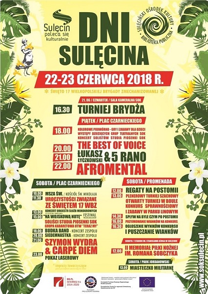 W sobotę od godziny 12:00 zapraszamy nad rzekę Postomię (Promenada przy Domu Joannitów). Wśród głównych atrakcji: Regaty na Postomii,  Plenerowy Turniej Szachowy, Otwarty Turniej w Boule, konkurs sprawnościowy i zabawy w parku linowym. O godzinie 14:30 zapraszamy na  Spływ na Byle-Czym po rzece Postomii, natomiast o w godzinach 16:00-16:30 odbędzie się konkurs na najpiękniejszy wianek. Tuż po ogłoszeniu wyników, wspólnie puścimy wianki do rzeki. Szczegółowe informacje dotyczące wymienionych wyżej konkursów znajdują się na stronie internetowej organizatora: www.soksulecin.pl