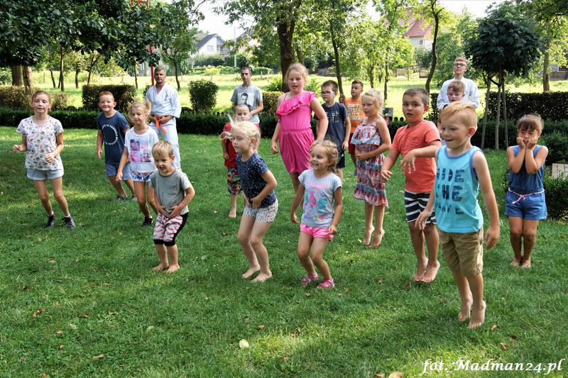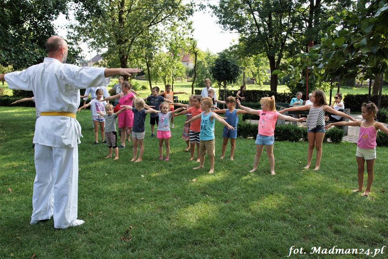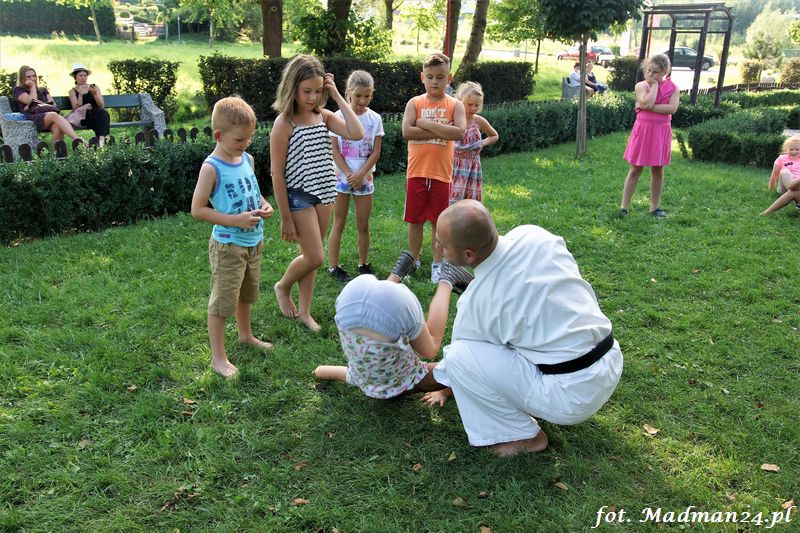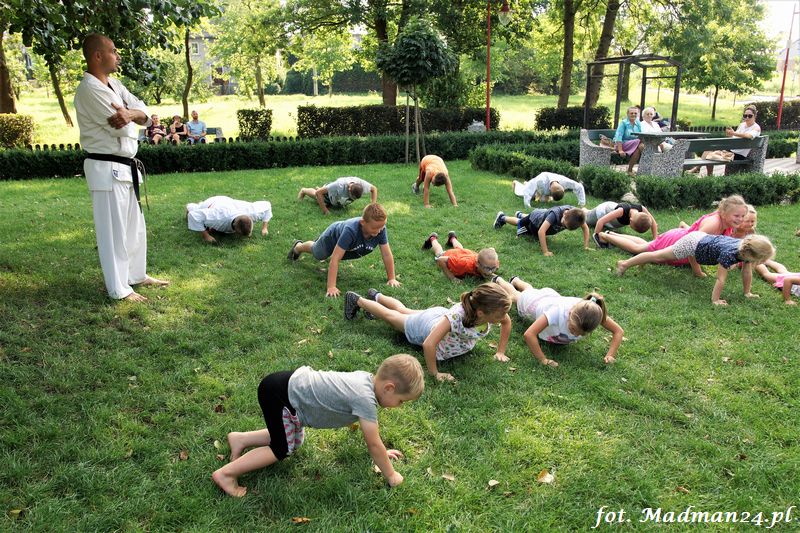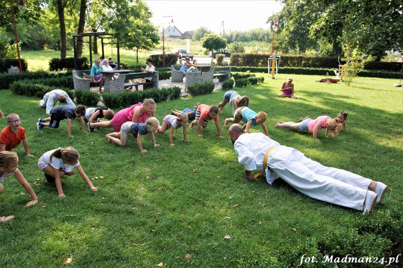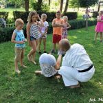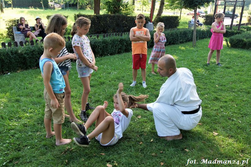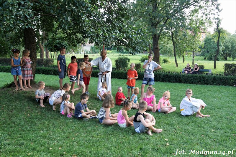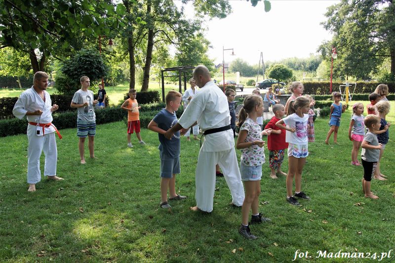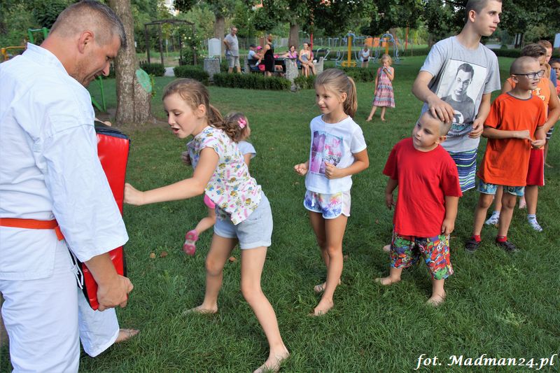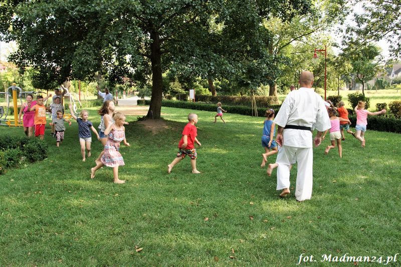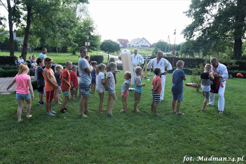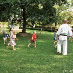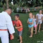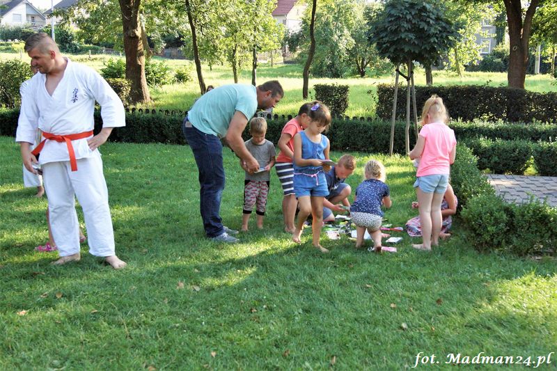 Letnia Akademia Karate Karola Buksztynowicza dobiła dzisiaj do półmetka. Pomimo plażowej pogody chętnych do treningu tym razem też nie brakowało. Schemat zajęć jest zawsze podobny, czyli trening połączony z zabawą. Jak zawsze zajęcia zakończyło rozdanie nagród. Upominki ufundował Karol Bukszynowicz.