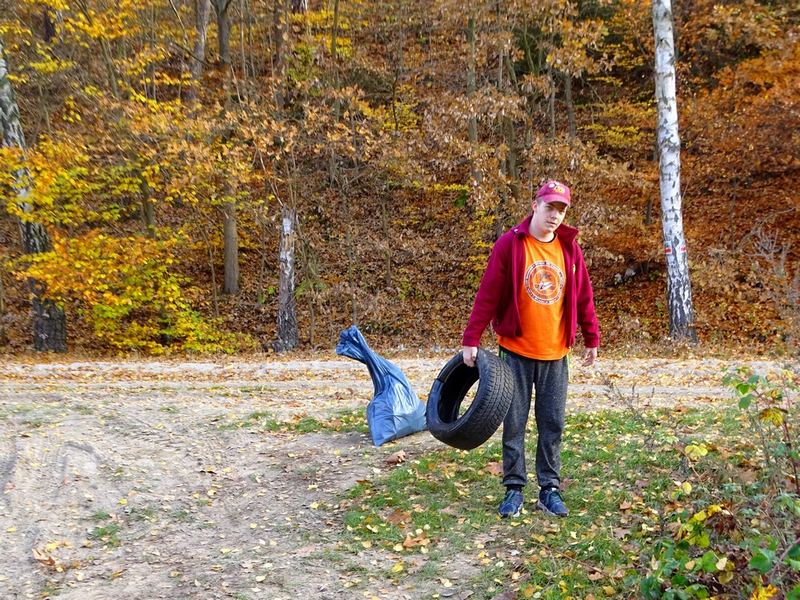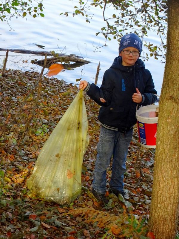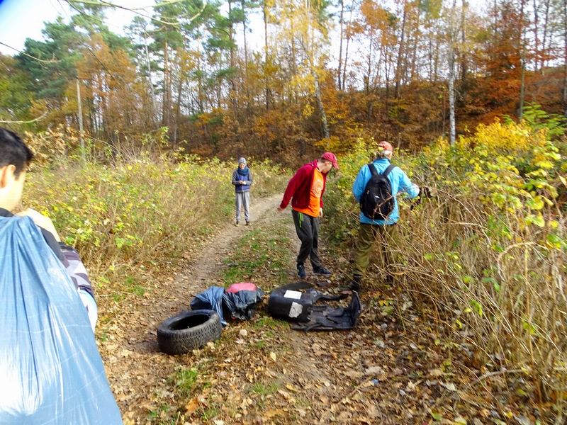 Naszą pieszą wycieczkę w koło jeziora rozpoczęliśmy od niestrzeżonej plaży kąpielowej. Każdy z uczestników otrzymał lateksowe rękawiczki i worki na śmiecie. Po wędkarzach śmieciarzach do worków trafiały opakowania po zanętach i robakach, puszki po kukurydzy, puszki i butelki po alkoholu, słoiki. Trafiliśmy również porzucone opony samochodowe, puste kanistry na paliwo. Jednym słowem wstyd.