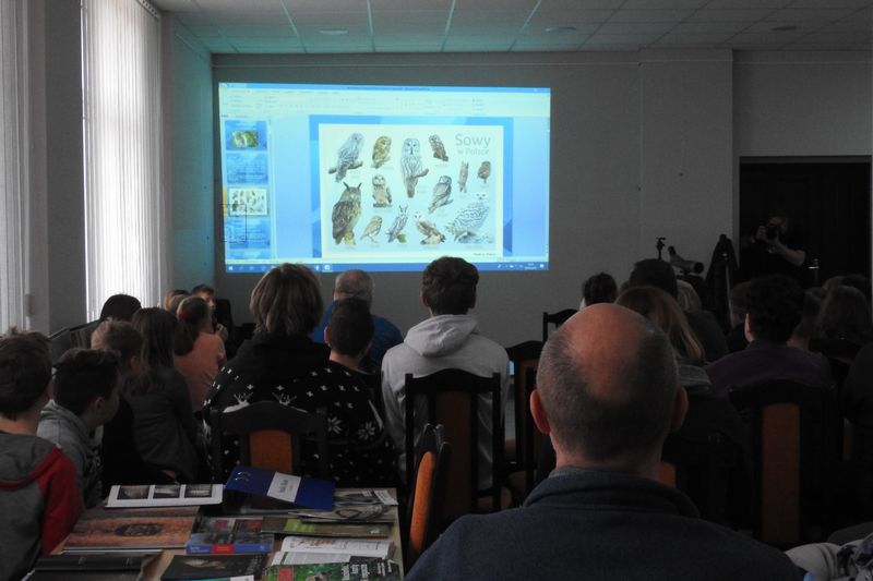 Pierwszym prelegentem był Robert Komorowski, który w bardzo ciekawy i przystępny sposób przybliżył informacje na temat biologii sów, zachowania, sposobu polowania oraz ciekawostek takich jak: rozpiętość skrzydeł puchacza, czy co powinniśmy zabrać ze sobą, aby być dobrze przygotowanym do obserwacji sów. Zaprezentował również współautorski film o sowach z lokalnych terenów, w którym autorzy (współautor Zbigniew Miszon) pokazali m.in. gatunki sów, obrączkowanie sów oraz ratowanie lęgu płomykówki w jednej z wieży Kościoła na terenie Gminy Słońsk.