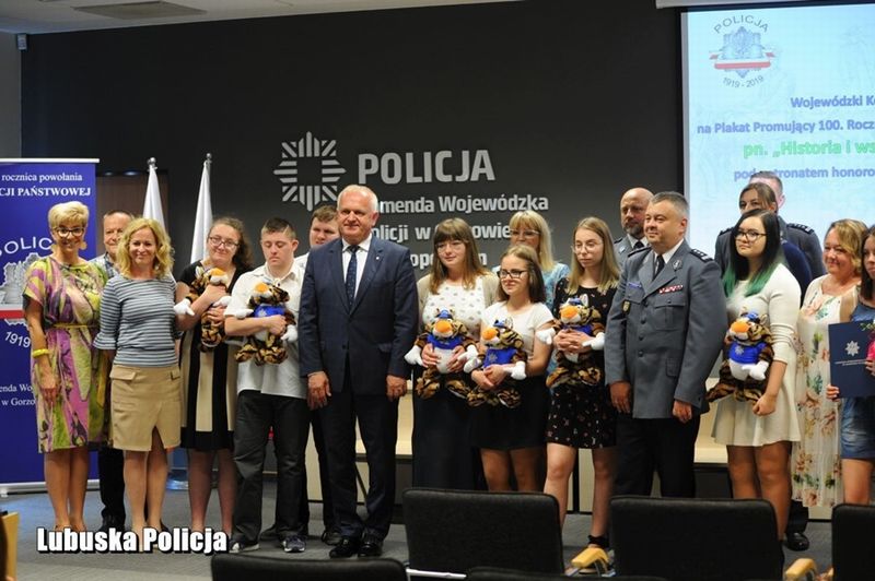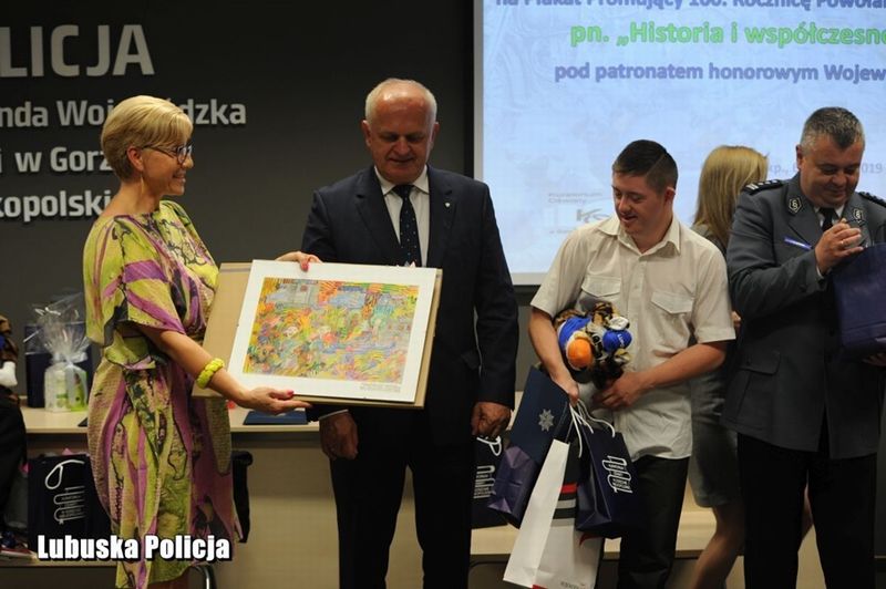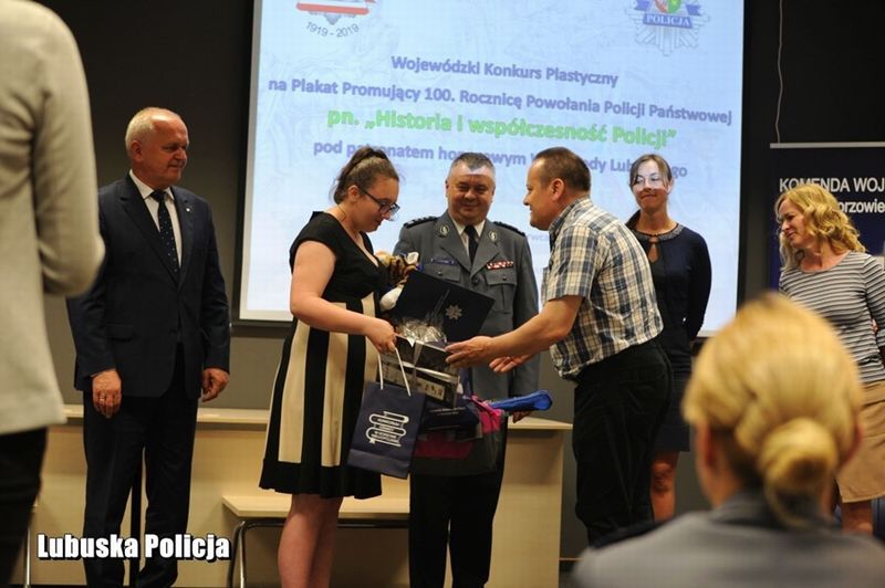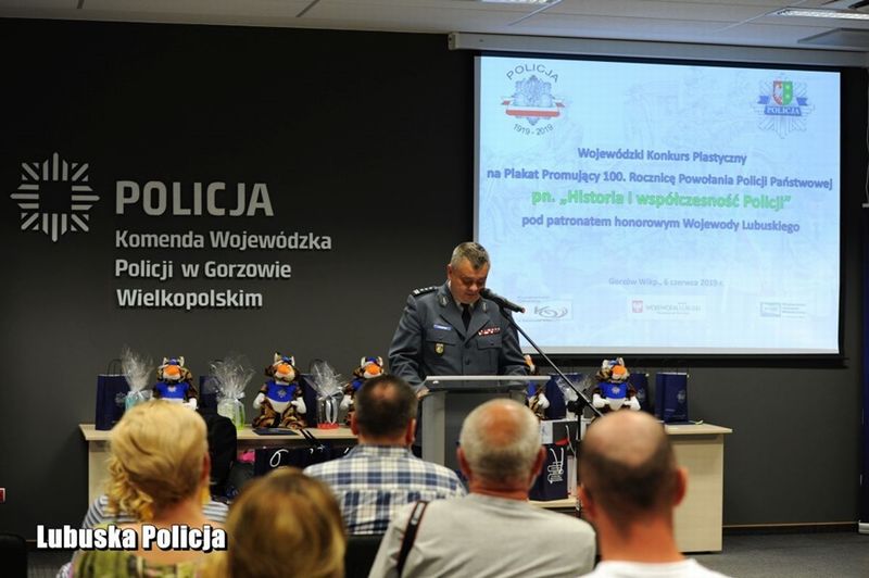 Uroczystość wręczenia nagród, w imieniu gospodarza uroczystości, Komendanta Wojewódzkiego Policji w Gorzowie Wlkp. nadinsp. Heleny Michalak, otworzył Zastępca Komendanta Wojewódzkiego Policji w Gorzowie Wlkp. insp. Jerzy Głąbowski, który powiedział: „24 lipca będziemy obchodzić okrągłe, setne urodziny. Do wspólnego świętowania, które trwa cały rok, zaprosiliśmy wielu gości, a poprzez uczestnictwo w konkursie, również Was – drodzy finaliści! Dzięki Waszym pracom, niezwykle kreatywnym i pomysłowym, mogliśmy spojrzeć na siebie – policjantów i naszą codzienną służbę oczami młodych ludzi XXI wieku. Warto podkreślić, że nie mieliście łatwego zadania. Plakat jest formą trudną. Wy musieliście połączyć tę formę z historią i zamknąć w jednym obrazie nasze policyjne dzieje. Odwoływaliście się do symboli, pracowaliście kolorami, wykorzystywaliście różne techniki plastyczne. Wybór tych najlepszych prac był niełatwy, bo każdy projekt miał w sobie „to coś”, był niepowtarzalny i wyjątkowy. Dziękuję wszystkim, którzy podjęli się tego wyzwania. Gratuluję Wam odwagi, determinacji i niezwykłych talentów”.