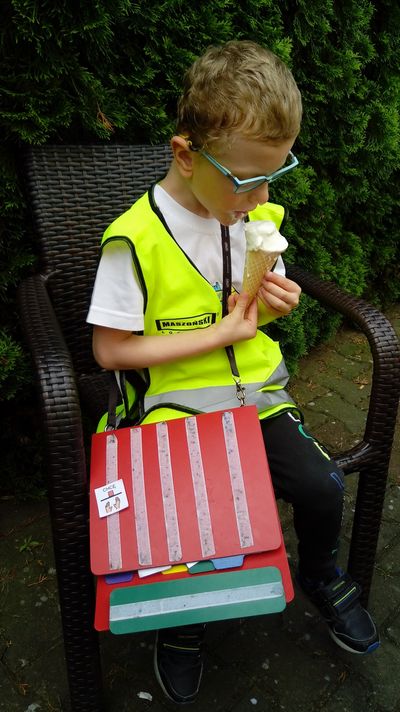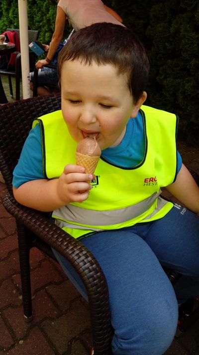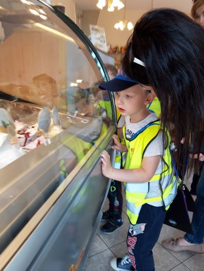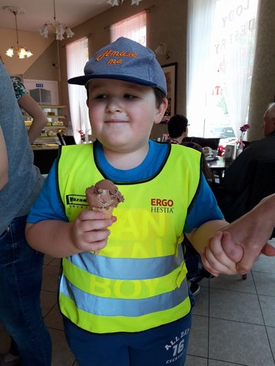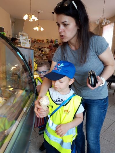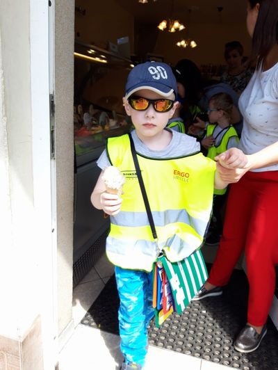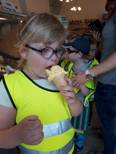 Dzielnie maszerowały w parach ulicami Sulęcina. Starszaki próbowały zgadnąć, dokąd idziemy- „Na plac zabaw?” obstawiał Kuba, „Na kulki?” pytała Amandzia. Nie zgadł nikt, ale już po wejściu do Cukierni Monika w Sulęcinie można było dostrzec pierwsze nieśmiałe uśmiechy. Po chwili oględzin, podczas których dzieci zapoznawały się z nazwami i kolorami lodów, każdy przedszkolak doczekał się upragnionej chwili- wyboru smaku swojego loda! Wyjątkowo nikomu nie przeszkadzało, że trzeba poczekać w kolejce. Dzieci nazywając, wskazują lub PECS-ując poprosiły o lody, po czym udały się do ogródka przy cukierni celem konsumpcji smacznych lodów. Po zdjęciach łatwo zauważyć, że działo się, oj działo się! Kilka opakowań chusteczek później przedszkolaki wróciły na szlak- sulęcińską promenadą, brudne, ale szczęśliwe dzieciaczki powędrowały do przedszkola.