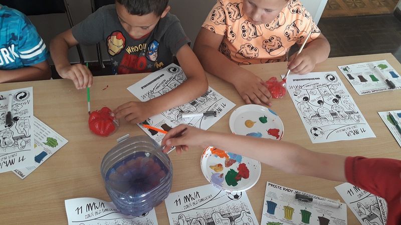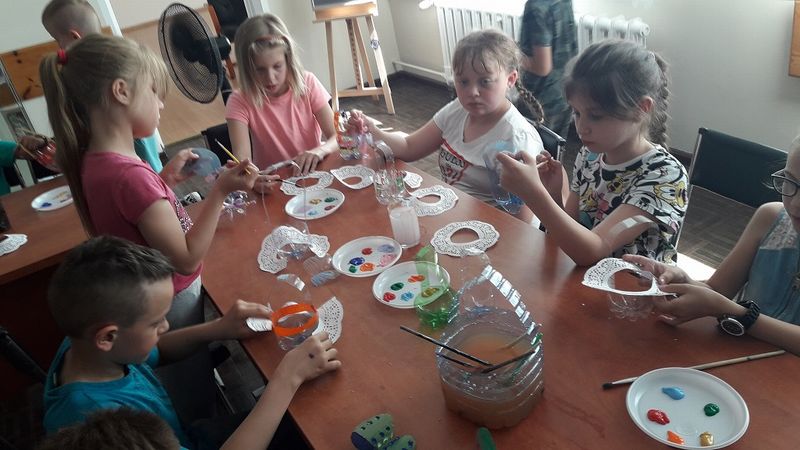Następnie dzieci uczestniczyły w warsztatach kreatywnych pod kierunkiem plastyka Urszuli Kołodziejczak i pracowników biblioteki. Powstały piękne motyle oraz biedronki z plastikowych butelek. Otrzymały one swoje ,,drugie życie”.