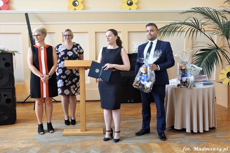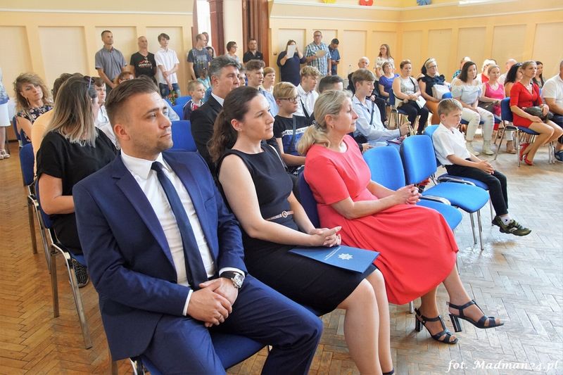 Pani Dyrektor Jolanta Kawecka-Smalec powitała wszystkich przybyłych gości, pracowników szkoły, rodziców i uczniów. Swoją obecnością zaszczycili nas pracownicy Wydziału Komunikacji Społecznej Komendy Wojewódzkiej Policji w Gorzowie Wlkp. Pani Magdalena Dudlej i Pan Krzysztof Pawłowski. Korzystając z okazji przywieźli ze sobą pamiątkowe dyplomy i nagrody za udział w Ogólnopolskim Festiwalu Form Teatralnych, Literackich, Filmowych i Malarskich „100 lat Policji”. Praca przestrzenna Klaudii Wyszyńskiej uczennicy klasy VII SP przedstawiająca postać Św. Michała Archanioła patrona Policji jako jedyna reprezentowała województwo lubuskie na eliminacjach centralnych. Praca powstała pod kierunkiem nauczyciela plastyki Pani Moniki Stegeman. W roku szkolnym 2018/2019 uczniowie MOS-u zdobyli wiele sukcesów w konkursach plastycznych na szczeblu wojewódzkim, ogólnopolskim i międzynarodowym.