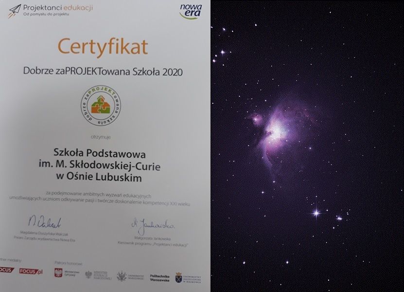 Certyfikat ten został przyznany Szkole za udział w Ogólnopolskim Konkursie Wydawnictwa Nowe Era ”Projektanci Edukacji”. Patronat na tym konkursem objęło między innymi Ministerstwo Cyfryzacji, Edukacji Narodowej, Uniwersytet Jagieloński, Politechnika Warszawska i Uniwersytet Warszawski. Projekt nr 948, noszący tytuł „Badamy zanieczyszczenie światłem nocnego nieba nad Ośnem Lubuskim” niestety nie uzyskał dofinansowania, ale pomysł został zauważony przez zespół redakcyjny czasopisma „Urania Postępy Astronomii”. Raz jeszcze dziękujemy za wsparcie w głosowaniu internetowym, to dla nas wiele znaczy.