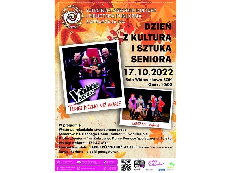 Sulęciński Ośrodek Kultury oraz Biblioteka Publiczna w Sulęcinie z okazji Dnia Seniora serdecznie zapraszają wszystkich seniorów na „Dzień z Kulturą i Sztuką Seniora”, który odbędzie się 17 października o godzinie 10.00 w Sulęcińskim Ośrodku Kultury