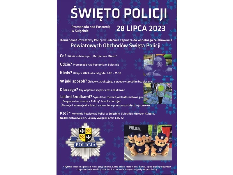 Piknik rodzinny sulęcińskiej Policji - zapraszamy do wspólnego celebrowania naszego święta Dokładnie za tydzień, na Promenadzie przy Postomii odbędzie się piknik rodzinny sulęcińskiej Policji pod nazwą "Bezpieczne Miasto". 28 lipca od godziny 9.00 , będziemy czekać na Państwa z masą atrakcji: pokaz sprzętu policyjnego, symulator zderzeń, konkursy, gry i zabawy. Ten szczególny dzień urozmaicą również stoiska Sulęcińskiego Ośrodka Kultury, Celowego Związku Gmin CZG-12 oraz Nadleśnictwa Sulęcin. O godzinie 12.00 zapraszamy Państwa do wspólnego celebrowania Powiatowych Obchodów Święta Policji, które odbędą się na placu przy Domu Joannitów. Prosimy o dokładne zapoznanie się z informacjami zamieszczonymi na plakacie. Podpowiadamy, że zadane pytania nie są przypadkowe. Każda osoba, która w dniu pikniku zgłosi się do policjantów z poprawną odpowiedzią, jakie jest ich znaczenie, otrzyma nagrodę niespodziankę. KPP Sulęcin