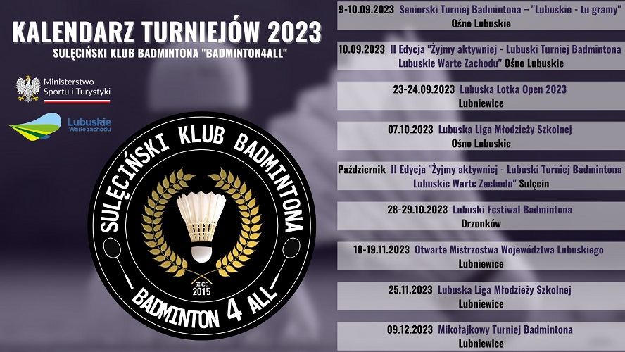 Serdecznie zapraszamy do rozpoczęcia przygody z badmintonem (rekreacyjnej lub profesjonalnej) WSZYSTKICH – dzieci, młodzież, dorosłych i seniorów, gdyż w tym sporcie nieważny jest wiek, a chęć aktywności fizycznej. W Sulęcińskim Klubie Badmintona „Badminton4all” wykwalifikowani instruktorzy do każdego podchodzą indywidualnie.