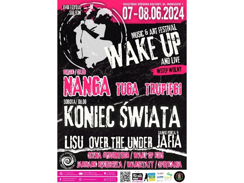 Wake Up & Live to jedna z najciekawszych propozycji muzycznych w województwie lubuskim, której początki sięgają do roku 2007. Początkowo przyciągając głównie polskich artystów i gości na przestrzeni lat Wake Up & Live stał się wydarzeniem międzynarodowym – Sulęcin odwiedzają nie tylko zespoły zza granicy (Niemcy, Białoruś, Ukraina, Czechy, Stany Zjednoczone, Izrael, Francja), ale również słuchacze z wielu zakątków Europy. To barwna impreza dla miłośników różnorodnych gatunków muzyki (rock, reggae, punk, ska, hip hop, soul), wyjątkowej atmosfery i przyjaźni. Festiwal charakteryzuje się nie tylko line upem na najwyższym muzycznym poziomie, ale i bardzo popularną strefą LIVE – wystawy, spotkania z ciekawymi ludźmi, warsztaty, akcje charytatywne, bogata oferta gastronomiczna i wiele innych. Wake Up and Live – tego nie możecie przegapić!