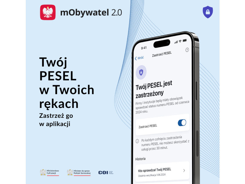 Liczba prób wyłudzeń kredytów na cudze dane rośnie. Ministerstwo Cyfryzacji wprowadziło więc do aplikacji mObywatel 2.0 usługę Zastrzeż PESEL. Dzięki niej użytkownik może zastrzec swój numer PESEL, cofnąć zastrzeżenie i ponownie je ustawić. Widzi też, jakie firmy i instytucje sprawdzały jego numer PESEL i z jakiego powodu. Od 1 czerwca 2024 instytucje finansowe będą miały obowiązek sprawdzenia statusu numeru PESEL np. przed udzieleniem pożyczki.