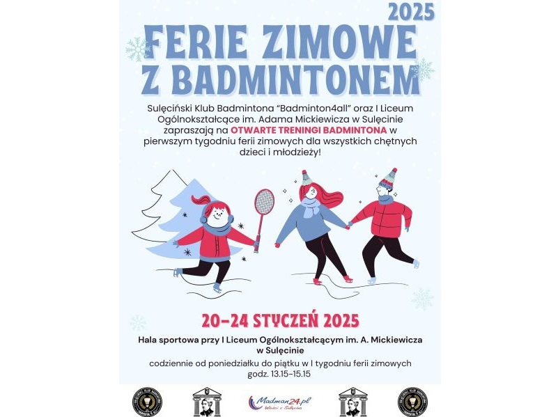 Sulęciński Klub Badmintona ,,Badminton4all” oraz I Liceum Ogólnokształcące im. A. Mickiewicza w Sulęcinie zapraszają na OTWARTE TRENINGI BADMINTONA w pierwszym tygodniu ferii zimowych dla wszystkich chętnych dzieci i młodzieży!