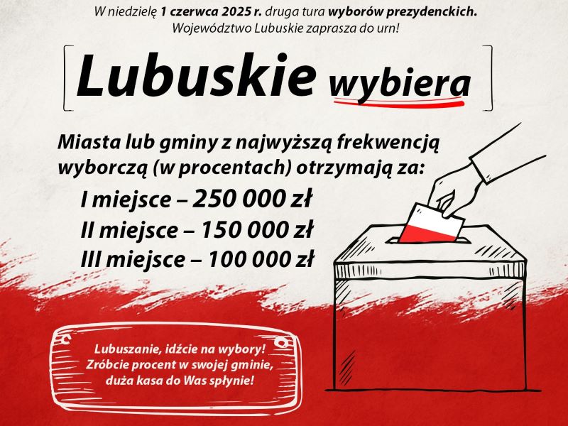 Szanowni Państwo, w związku ze zbliżającą się II turą wyborów prezydenckich (1 czerwca 2025 r.), Samorząd Województwa Lubuskiego zaprasza do włączenia się w regionalną akcję profrekwencyjną „Lubuskie wybiera!”.