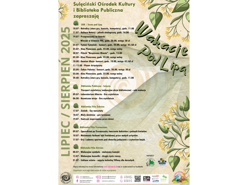 Sulęciński Ośrodek Kultury i Biblioteka Publiczna w Sulęcinie zapraszają mieszkańców i gości do udziału w letnim cyklu wydarzeń „Wakacje pod Lipą 2025″. W programie: koncerty, kino plenerowe, warsztaty, gry, rodzinne pikniki i zajęcia wakacyjne w bibliotekach filialnych.