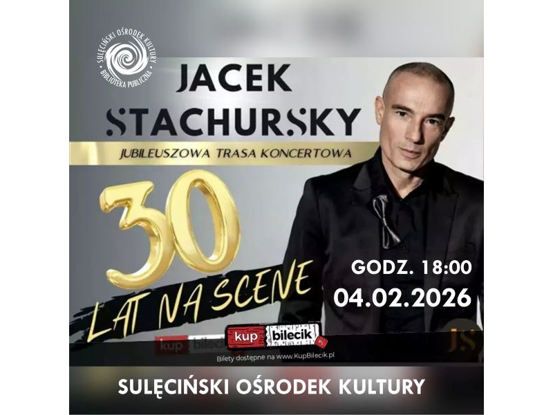 4 lutego 2026 roku o godz. 18:00 scena Sulęcińskiego Ośrodka Kultury należeć będzie do jednego z najbardziej rozpoznawalnych artystów polskiej muzyki tanecznej i pop. Jacek Stachursky wystąpi w Sulęcinie w ramach koncertu jubileuszowego z okazji 30-lecia działalności estradowej.