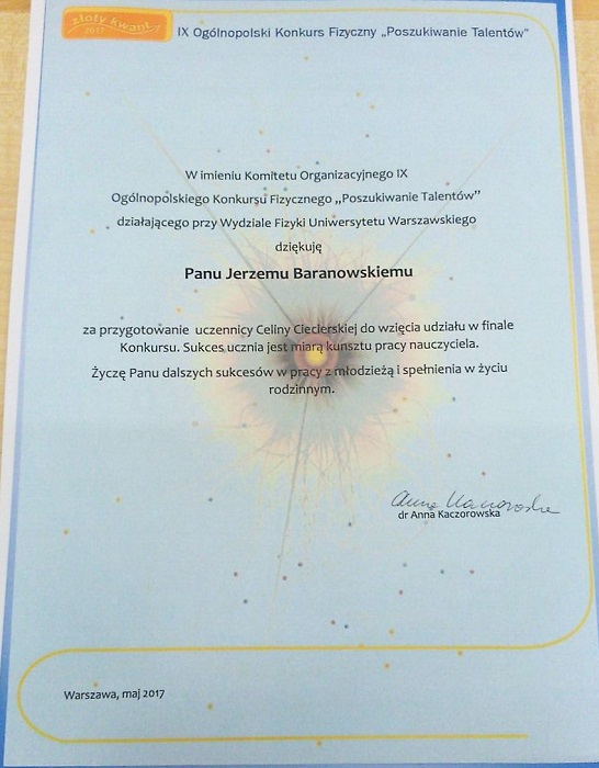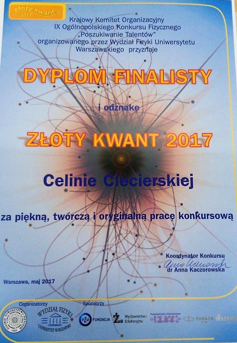 Celina otrzymała dyplom z tytułem finalisty, odznakę „Złoty kwant” i całą torbę pełną upominków. W podobny sposób podziękowano nauczycielom, za przygotowanie uczniów. Pan Baranowski, przed konkursem, w czasie podróży i na miejscu, służył pomocą i udzielał wskazówek.