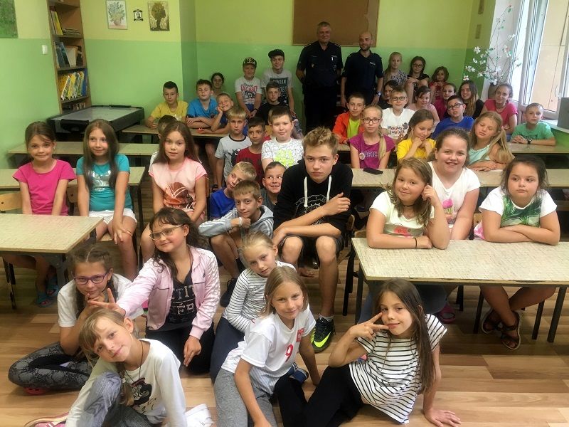 Z dziećmi spotkali się także policjanci, którzy opowiadali o bezpieczeństwie na drogach i przestrzegali przed niebezpieczeństwami jakie czyhają na dzieci i młodzież podczas wakacji.