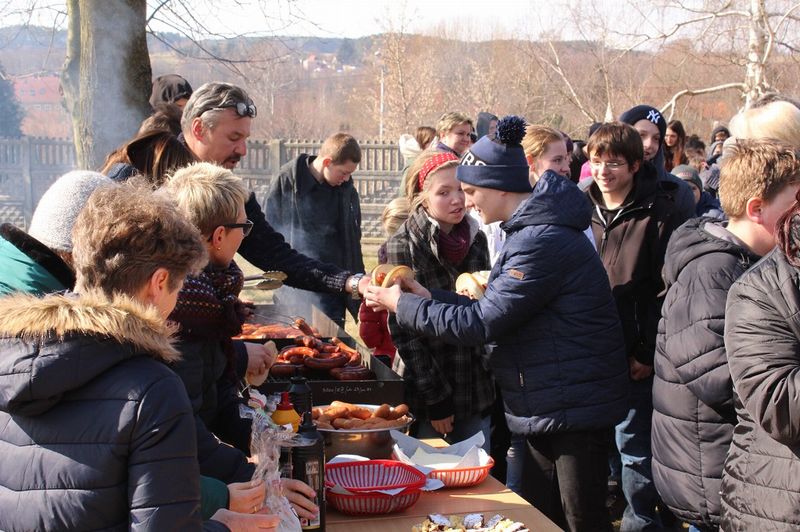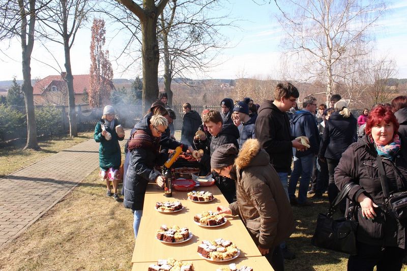 Następnie, żeby tradycji stało się zadość wszyscy artyści, podopieczni, rodzice i zaproszeni goście powędrowali na plac szkolny gdzie nastąpiło spalenie ekologicznej marzanny. Zaraz potem można było skosztować ciepłych kiełbasek z grilla i upieczonych przez naszych uczniów pysznych ciast.