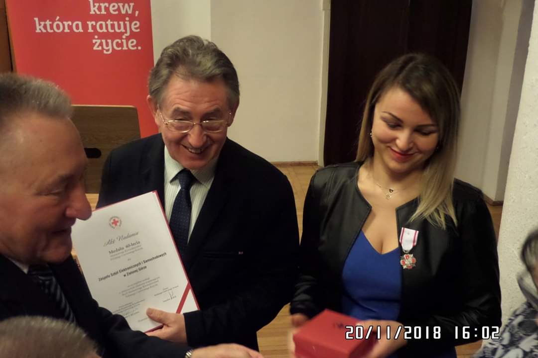 Medal dla ZSLiZ – 20 listopada 2018r. w Filharmonii Zielonogórskiej odbył się wielki Jubileusz 60-lecia Honorowego Krwiodawstwa Polskiego Czerwonego Krzyża. Podczas jubileuszu honorowi krwiodawcy województwa lubuskiego otrzymali odznaczenia i wyróżnienia za swoją ofiarność. Wśród odznaczonych znalazł się nauczyciel Naszej Szkoły – opiekun Szkolnego Koła Honorowych Dawców Krwi „Dar Serca”, pani Anna Sobieraj. Uchwałą Kapituły Odznaki Honorowej Polskiego Czerwonego Krzyża została wyróżniona Odznaką Honorową PCK. Dekoracji dokonał Prezes Lubuskiego Oddziału Okręgowego PCK, pan Zbigniew Martyniuk wraz z członkiem Prezydium Krajowej Rady HDK PCK, panem Janem Kowalczykiem.