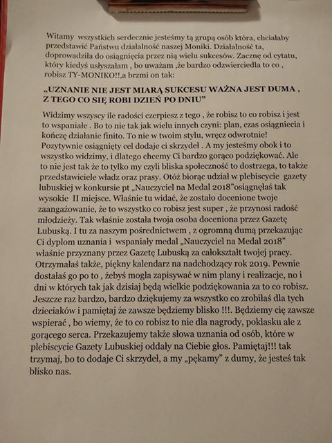 W imieniu Agnieszki i swoim, pragnę podziękować dyrekcji za zaproszenie oraz umożliwienie wręczenia wyróżnienia Monice Stegemam.