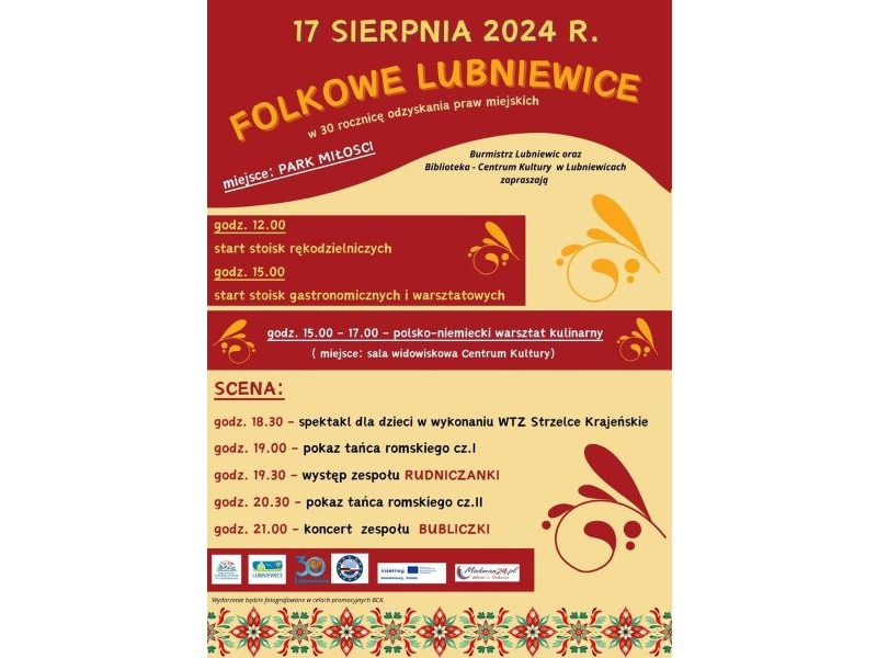 Tradycyjnie w sierpniu zapraszamy na Folkowe Lubniewice. Jeśli masz ochotę zaprezentować swoje stoisko wystawiennicze np. z rękodziełem- zapraszamy do kontaktu pod numerem 95 755 7639 lub 500 191 944