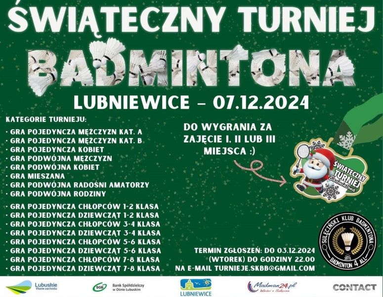 Już 07.12.2024 w Lubniewicach odbędzie się coroczny ŚWIĄTECZNY TURNIEJ BADMINTONA