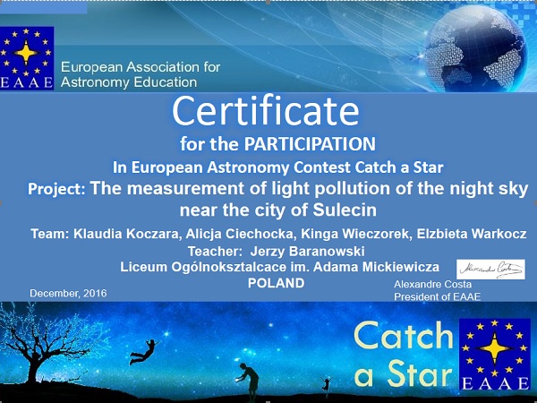 Certyfikaty Europejskiego Konkursu astronomicznego Catch a Star 2016 dla uczniów I LO W grudniu ubiegłego roku nasza ekipa w składzie:…
