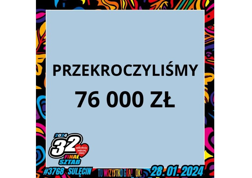 Sztab Sulęcin Właśnie kończymy liczenie. Możemy Wam powiedzieć, że na chwilę obecną zebraliśmy ponad 76 000 zł. Dokładną kwotę podamy…