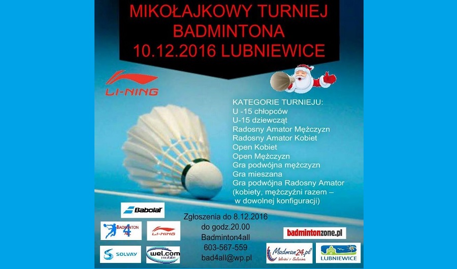 10 grudnia 2016 zapraszamy do Lubniewic na Mikołajkowy Turniej Badmintona. Madman