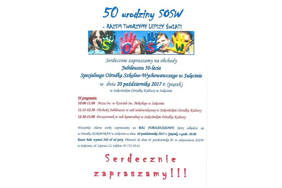 Zapraszamy na jubileusz! 50 Urodziny SOSW Szczegóły na zamieszczonym plakacie.