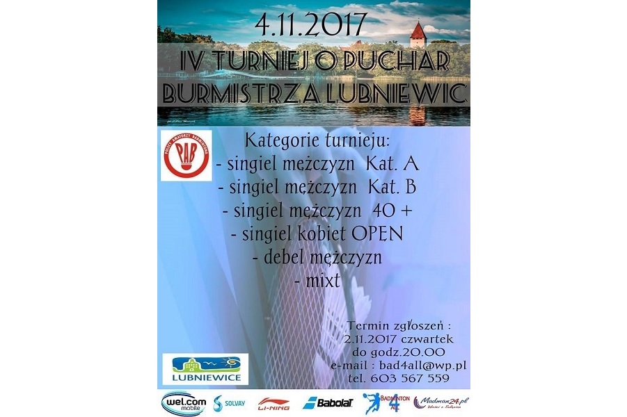 O Puchar Burmistrza Lubniewic Turniej Badmintona w Lubniewicach Organizator –Badminton4all Patronat medialny – Madman24.pl