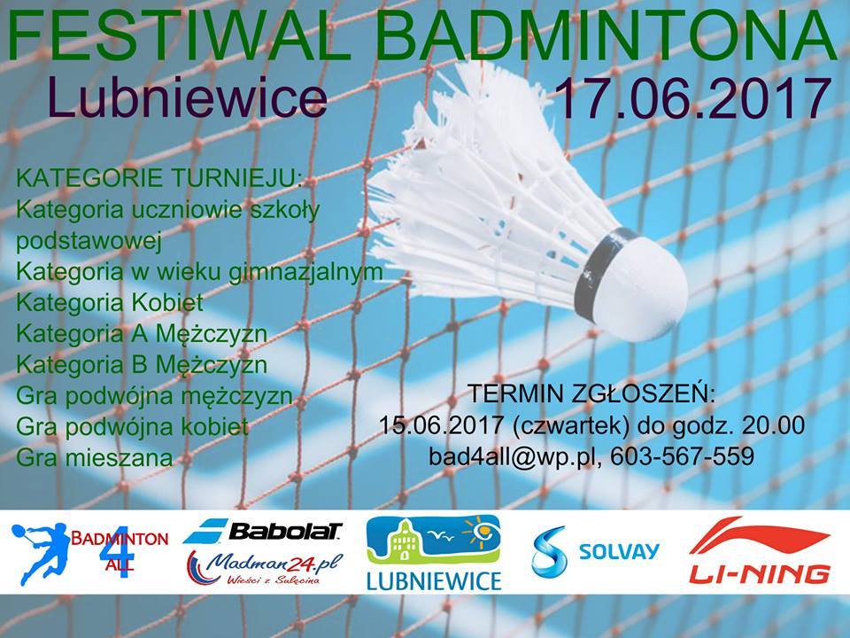 Zapraszamy na turniej badmintona do Lubniewic Festiwal Badmintona Lubniewice 17.06.2017r. Festiwal Badmintona – przyjedź i zagraj! Madman