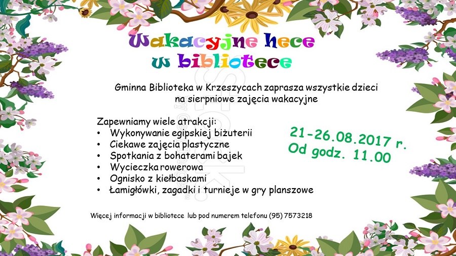Gminna Biblioteka Publiczna w Krzeszycach Wakacyjne hece w bibliotece, czyli sierpniowe atrakcje dla dzieci. Zapraszamy w dniach 21-26.08.2017r.