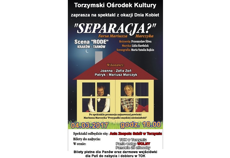 Separacja w Torzymiu Z okazji nadchodzącego Dnia Kobiet pragniemy zaprosić Państwa na spektakl „Separacja” w wykonaniu grupy teatralnej „Scena RODE”…